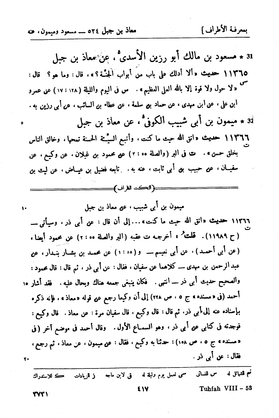 11365 -[سي] حديث ألا أدلك على باب من أبواب الجنَّة؟، قال: وما هو؟ قال: لا حول ولا قوة إلا بالله العلي العظيم. س في اليوم والليلة (128: 17) عن عمرو بن علي، عن ابن مهدي، عن حماد بن سلمة، عن عطاء بن السائب، عن أبي رزين به.