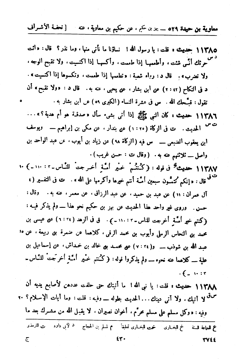 11387 -[ت ق] حديثٌ في قوله: كُنتُمْ خيْر أُمَّةٍ أُخرجتْ للنَّاس (3: 110) قال: إنكم تُتمُّون سبعين أُمَّة أنتم خيرها وأكرهما على الله. ت في التفسير (4 آل عمران: 11) عن عبد بن حميد، عن عبد الرزاق، عن معمر , عنه به. وقال: حسن. وروى غير واحد هذا الحديث عن بهز بن حكيم نحو هذا - ولم يذكر فيه: كنتم خير أُمَّةٍ أُخرجت للناس (3: 110) . ق في الزهد (34: 6) عن عيسى بن محمد بن النحاس الرملي وأيوب بن محمد الرقي، كلاهما عن ضمرة بن ربيعة، عن عبد الله بن شوذب - و (24: 7) عن محمد بن خالد بن خداش، عن إسماعيل ابن علية - كلاهما عنه نحوه - ولم يذكروا قوله: كُنتم خيْر أُمَّةٍ أُخرجَتْ للنَّاس (3: 10) .