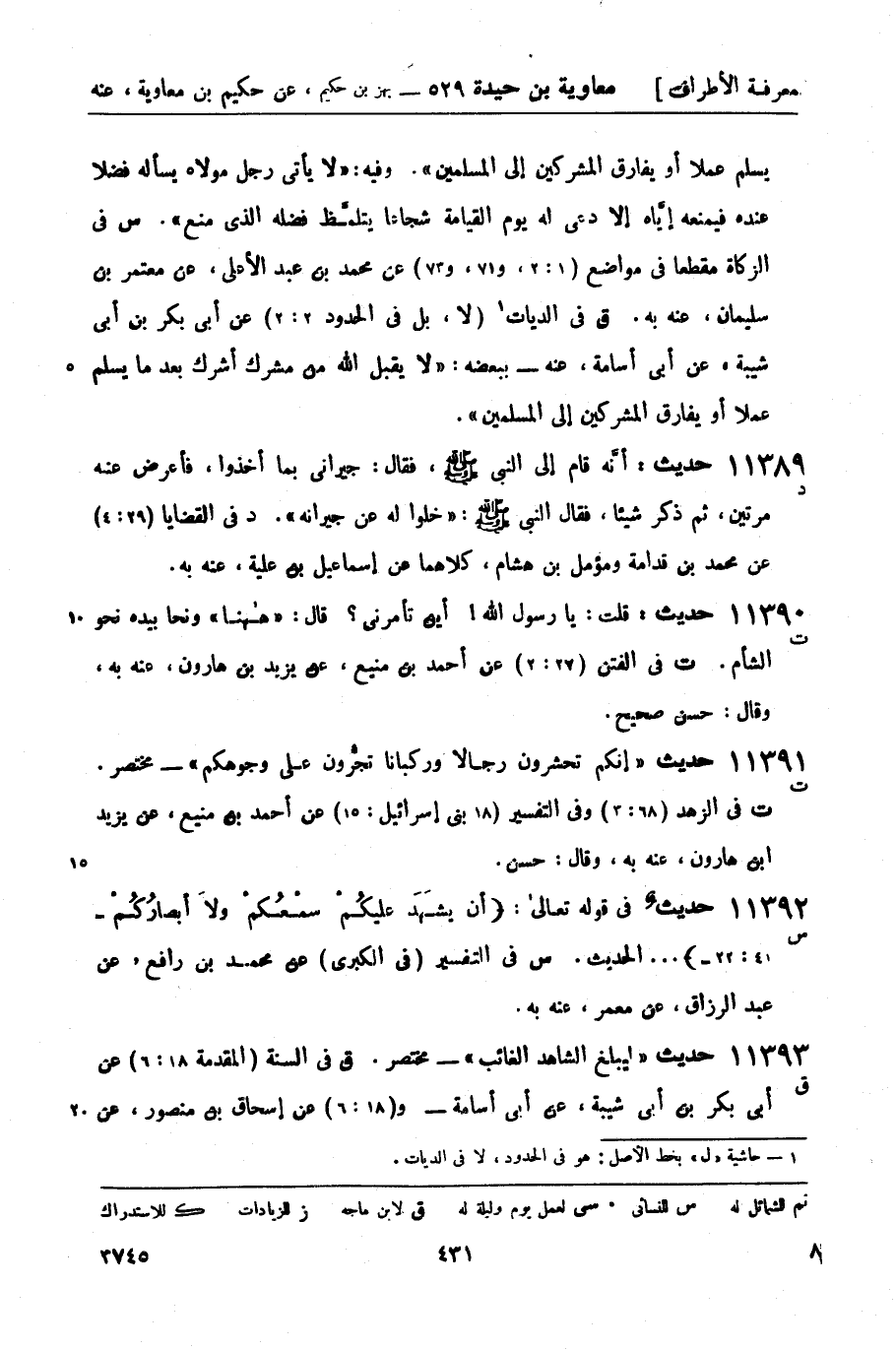 11391 -[ت] حديث إنكم تحشرون رجالاً وركباناً تجرُّون على وجوهكم - مختصر. ت الزهد (68: 3) وفي التفسير (18 بني إسرائيل: 15) عن أحمد بن منيع، عن يزيد بن هارون , عنه به. وقال: حسن.