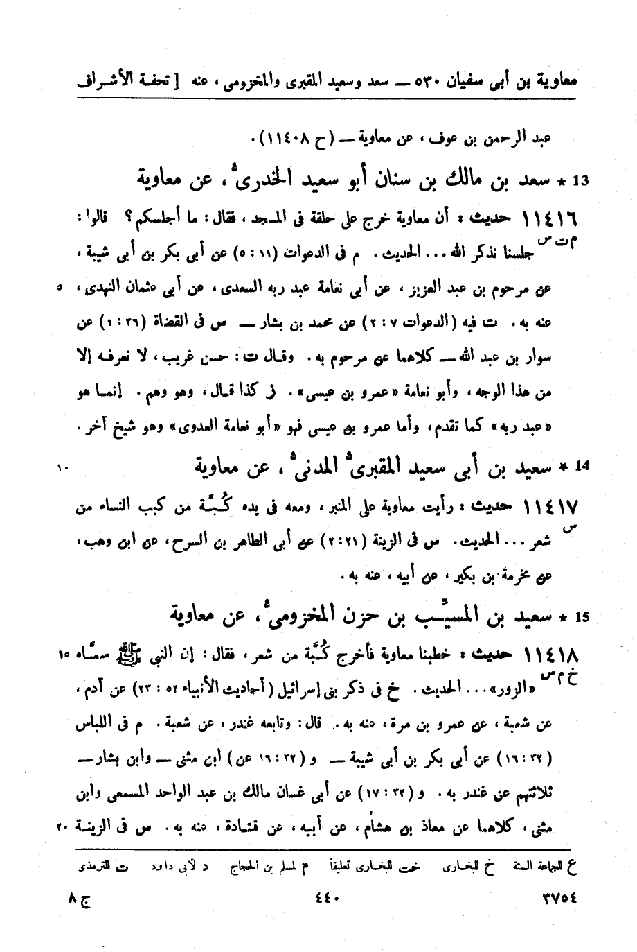 11416 -[م ت س] حديث: أن معاوية خرج على حلقة في المسجد، فقال: ما أجلسكم؟ قالوا: جلسنا نذكر الله ... الحديث. م في الدعوات (11: 5) عن أبي بكر بن أبي شيبة، عن مرحوم بن عبد العزيز، عن أبي نعامة عبد ربه السعدي، عن أبي عثمان النهدي، عنه به. ت فيه (الدعوات 7: 2) عن محمد بن بشار - س في القضاة (36: 1) عن سوار بن عبد الله - كلاهما عن مرحوم به. وقال ت: حسن غريب، لا نعرفه إلا من هذا الوجه، وأبو نعامة عمرو بن عيسى. ز كذا قال، وهو وهم. إنما هو عبد ربه كما تقدم، وأما عمرو بن عيسى فهو أبو نعامة العدوي وهو شيخ آخر.