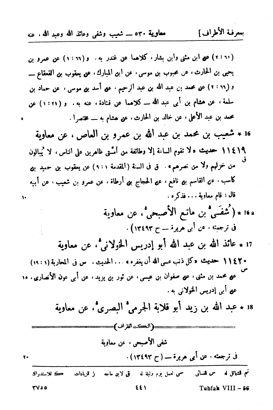 a 16 (شُفَيُّ بن ماتع الأصبحيُّ، عن معاوية في ترجمته عن أبي هريرة - ح 13493) .