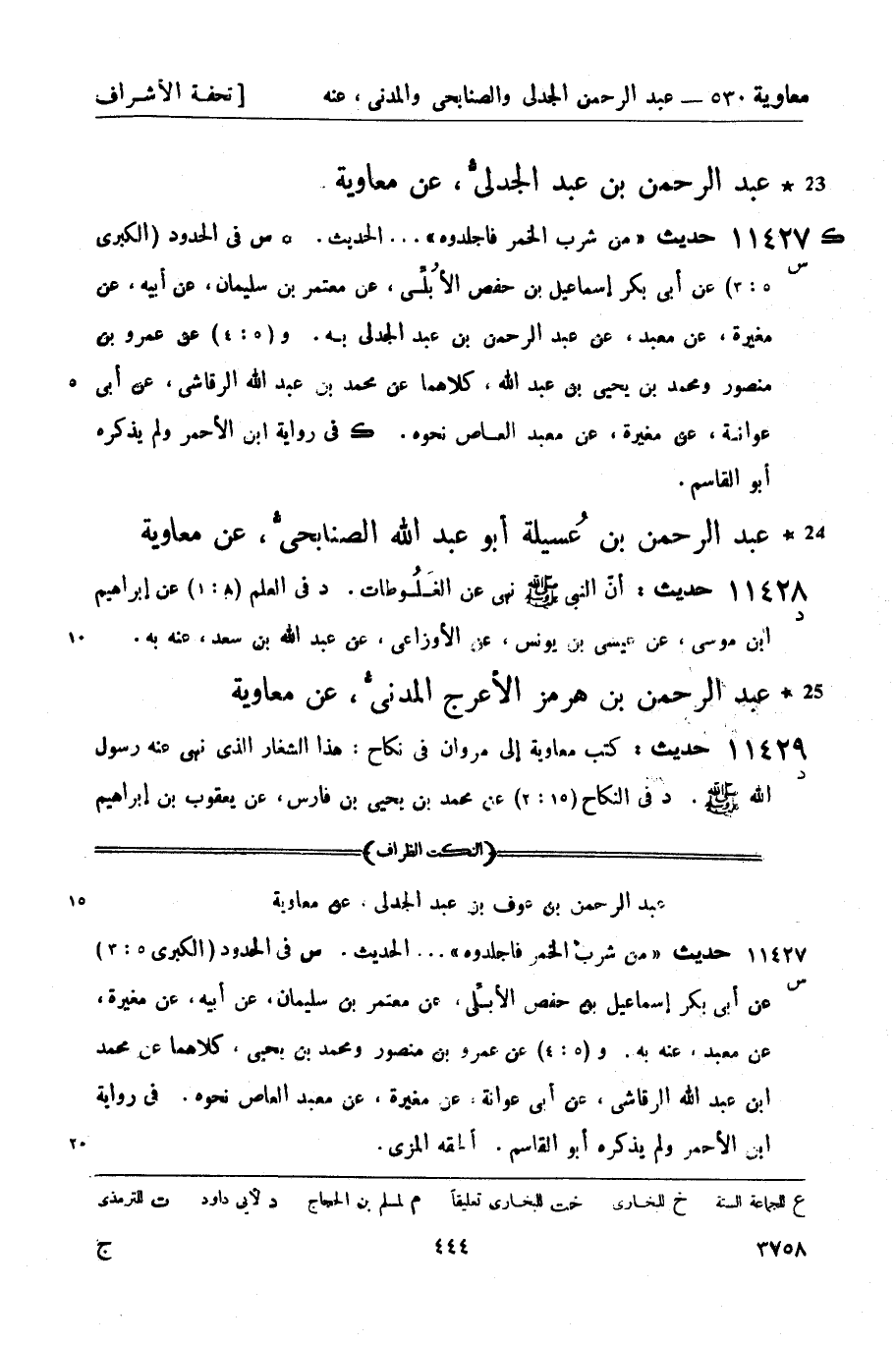 11427 -[س] حديث من شرب الخمر فاجلدوه ... الحديث. (ك) س في الحدود (الكبرى 5: 3) عن أبي بكر إسماعيل بن حفص الأبُلِّي، عن معتمر بن سليمان، عن أبيه، عن مغيرة، عن معبد، عن عبد الرحمن بن عبد الجدلي به. و (5: 4) عن عمرو بن منصور ومحمد بن يحيى بن عبد الله، كلاهما عن محمد بن عبد الله الرقاشي، عن أبي عوانة، عن مغيرة، عن معبد العاص نحوه. ك في رواية ابن الأحمر ولم يذكره أبو القاسم