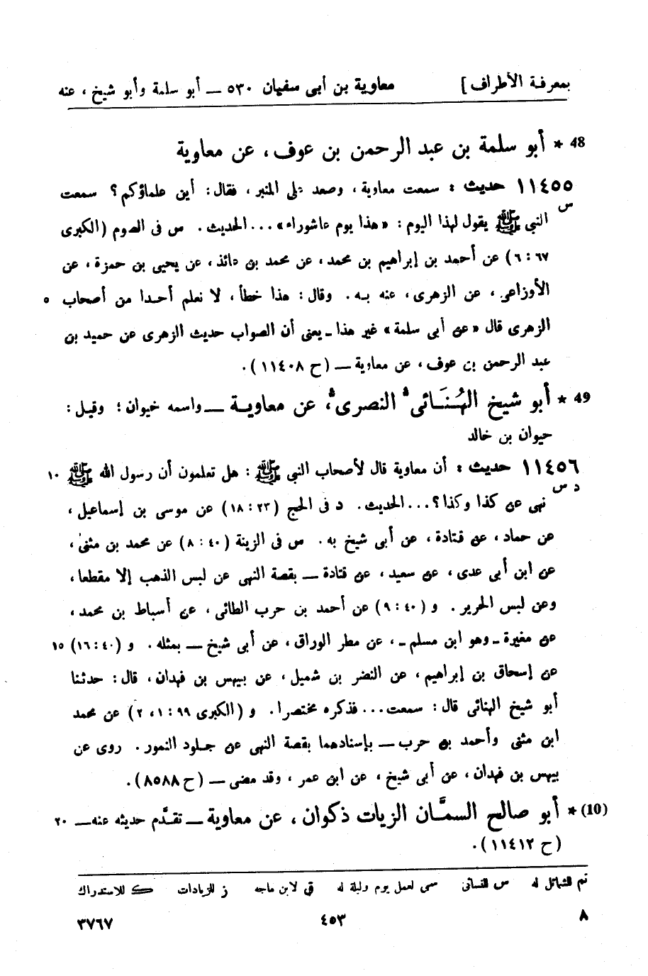 11456 -[د س] حديث: أن معاوية قالا لأصحاب النبيّ صَلَّى اللَّهُ عَلَيْهِ وَسَلَّمَ: هل تعلمون أن رسول الله صَلَّى اللَّهُ عَلَيْهِ وَسَلَّمَ نهى عن كذا وكذا؟ ... الحديث. د في الحج (23: 18) عن موسى بن إسماعيل، عن حماد، عن قتادة، عن أبي شيخ به. س في الزينة (40: 8) عن محمد بن مثنى، عن ابن أبي عدي، عن سعيد، عن قتادة - بقصة النهي عن لبس الذهب إلا مقطعاً، وعن لبس الحرير. و (40: 9) عن أحمد بن حرب الطائي، عن أسباط بن محمد، عن مغيرة - وهو ابن مسلم -، عن مطر الوراق، عن أبي شيخ - بمثله. و (40: 16) عن إسحاق بن إبراهيم، عن النضر بن شميل، عن بيهس بن فهدان، قال: حدثنا أبو شيخ الهنائي قال: سمعت ... فذكره مختصراً. و (الكبرى 99: 1، 2) عن محمد بن مثنى وأحمد بن حرب - بإسنادهما بقصة النهي عن جلود النمور. روى عن بيهس بن فهدان، عن أبي شيخ، عن ابن عمر، وقد مضى - (ح 8588) .