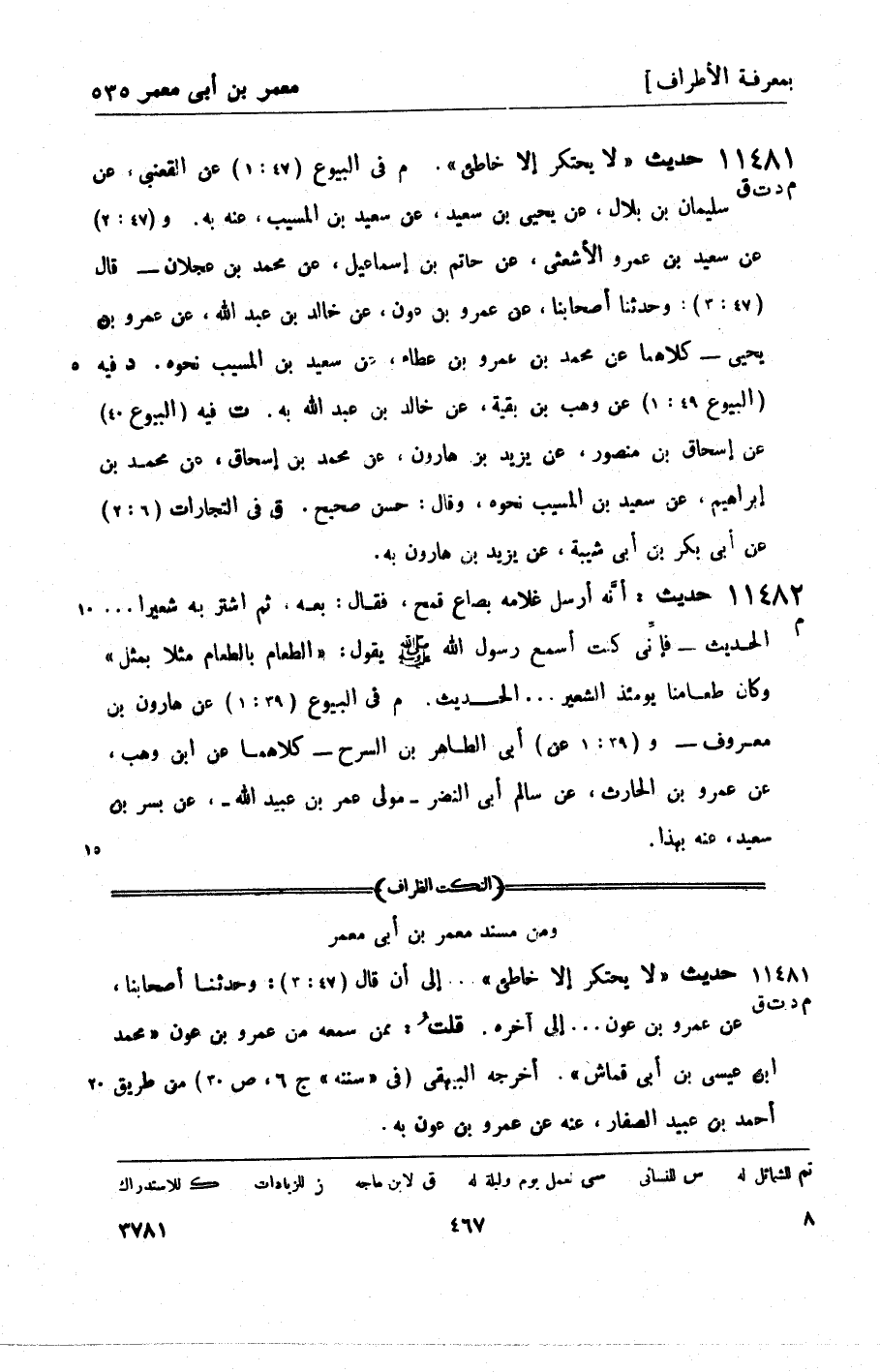 11481 -[م د ت ق] حديث لا يحتكر إلا خاطئ. م في البيوع (47: 1) عن القعنبي، عن سليمان بن بلال، عن يحيى بن سعيد، عن سعيد بن المسيب، عن به. و (47: 2) عن سعيد بن عمرو الأشعثي، عن حاتم بن إسماعيل، عن محمد بن عجلان - قال (47: 3) : وحدثنا أصحابنا، عن عمرو بن عون، عن خالد بن عبد الله، عن عمرو بن يحيى - كلاهما عن محمد بن عمرو بن عطاء، عن سعيد بن المسيب نحوه. د فيه (البيوع 49: 1) عن وهب بن بقية، عن خالد بن عبد الله به. ت فيه (البيوع 40) عن إسحاق بن منصور، عن يزيد بن هارون، عن محمد بن إسحاق، عن محمد بن إبراهيم، عن سعيد بن المسيب نحوه، وقال: حسن صحيح. ق في التجارات (6: 2) عن أبي بكر بن أبي شيبة، عن يزيد بن هارون به.
