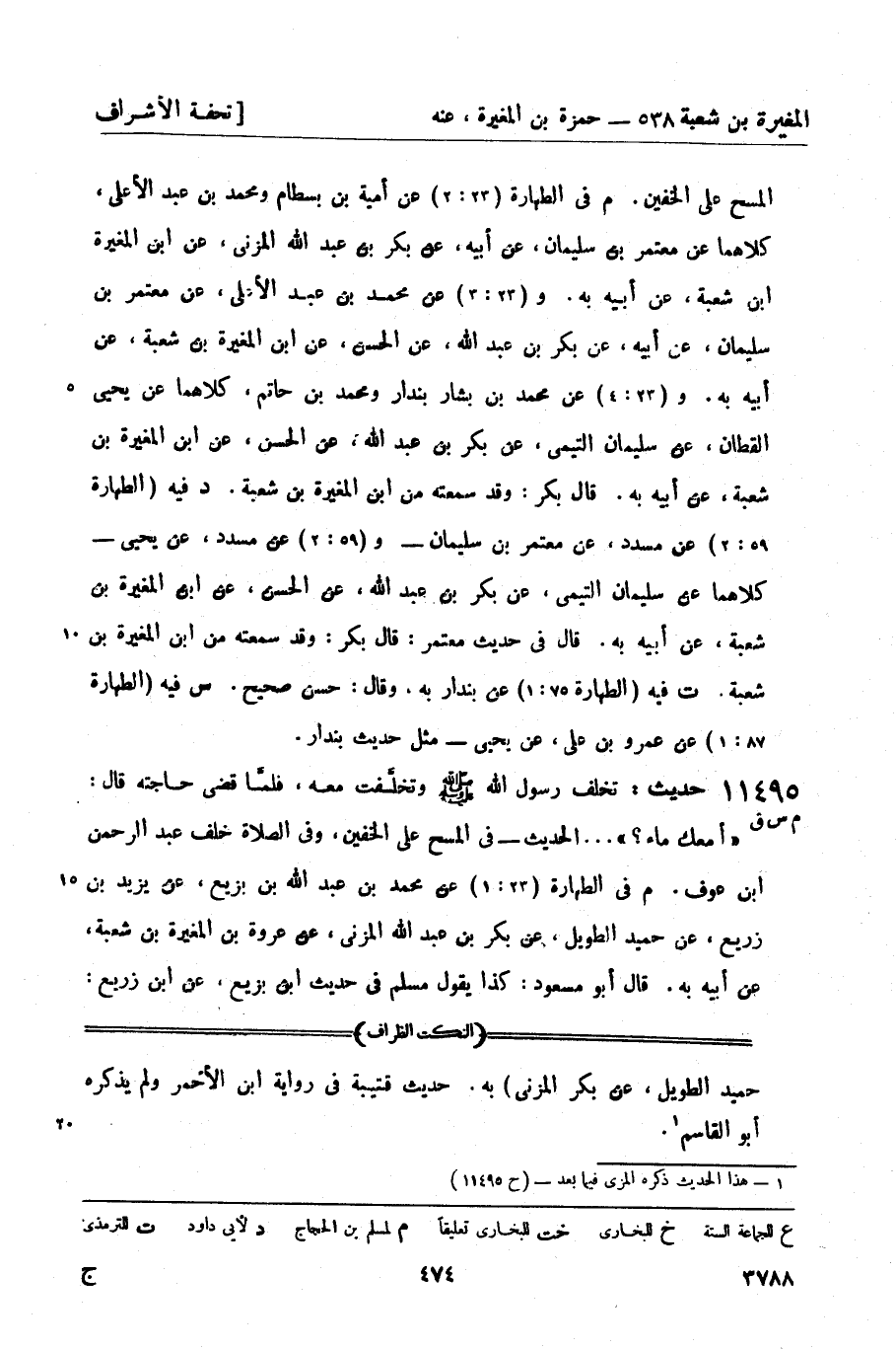 11495 -[م س ق] حديث: تخلف رسول الله صَلَّى اللَّهُ عَلَيْهِ وَسَلَّمَ وتخلَّفت معه، فلمَّا قضى حاجته قال: أمعك ماء؟ ... الحديث - في المسح على الخفين، وفي الصلاة خلف عبد الرحمن بن عوف. م في الطهارة (23: 1) عن محمد بن عبد الله بن بزيع، عن يزيد بن زريع، عن حميد الطويل، عن بكر بن عبد الله المزني، عن عروة بن المغيرة بن شعبة، عن أبيه به. قال أبو مسعود: كذا يقول مسلم في حديث ابن بزيع، عن ابن زريع: -[475]- عروة بن المغيرة وخالفه الناس فقالوا: حمزة بن المغيرة بدل عروة بن المغيرة. وفي الصلاة (22: 5) عن محمد بن رافع وحسن الحلواني، كلاهما عن عبد الرزاق، عن ابن جريج، عن الزهري، عن إسماعيل بن محمد بن سعد، عن حمزة بن المغيرة بن شعبة به. س في الطهارة (87: 2) عن عمرو بن علي وحميد ابن مسعدة، كلاهما عن يزيد بن زريع - (ك) و (الكبرى 108: 3) عن قتيبة بن سعيد، عن ابن أبي عدي - كلاهما عن حميد الطويل، عن بكر بن عبد الله المزني، عن حمزة بن المغيرة بن شعبة، عن أبيه به - ولم يذكر قصة عبد الرحمن بن عوف. و (المجتبى 97) عن محمد بن منصور، عن سفيان، عن إسماعيل بن محمد بن سعد - أتم منه - ولم يذكر قصة عبد الرحمن بن عوف. ق في الصلاة (182) عن محمد بن مثنى، عن ابن أبي عدي، عن حميد الطويل - بقصة الصلاة خلف عبد الرحمن بن عوف حسب. ك حديث س عن قتيبة في رواية ابن الأحمر ولم يذكره أبو القاسم.