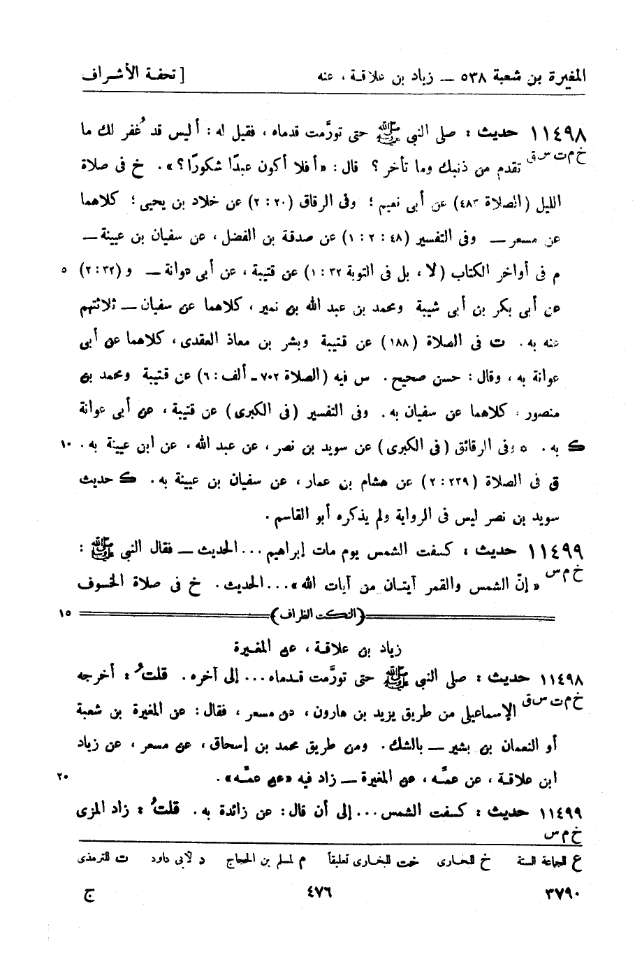 11498 -[خ م ت س ق] حديث: صلى النبيّ صَلَّى اللَّهُ عَلَيْهِ وَسَلَّمَ حتى تورَّمت قدماه، فقيل له: أليس قد غُفر لك ما تقدم من ذنبك وما تأخر؟ قال: أفلا أكون عبداً شكوراً؟. خ في الصلاة الليل (الصلاة 483) عن أبي نعيم؛ وفي الرقاق (20: 2) عن خلاد بن يحيى؛ كلاهما عن مسعر وفي التفسير (48: 2: 1) عن صدقة بن الفضل، عن سفيان بن عيينة - م في أواخر الكتاب (لا، بل في التوبة 32: 1) عن قتيبة، عن أبي عوانة - و (32: 2) عن أبي بكر بن أبي شيبة ومحمد بن عبد الله بن نمير، كلاهما عن سفيان - ثلاثتهم , عنه به. ت في الصلاة (188) عن قتيبة وبشر بن معاذ العقدي، كلاهما عن أبي عوانة به، وقال: حسن صحيح. س فيه (الصلاة 702 - ألف: 6) عن قتيبة ومحمد بن منصور، كلاهما عن سفيان به. وفي التفسير (في الكبرى) عن قتيبة، عن أبي عوانة به. (ك) وفي الرقائق (في الكبرى) عن سويد بن نصر، عن عبد الله، عن ابن عيينة به. ق في الصلاة (239: 2) عن هشام بن عمار، عن سفيان بن عيينة به. ك حديث سويد بن نصر ليس في الرواية ولم يذكره أبو القاسم.