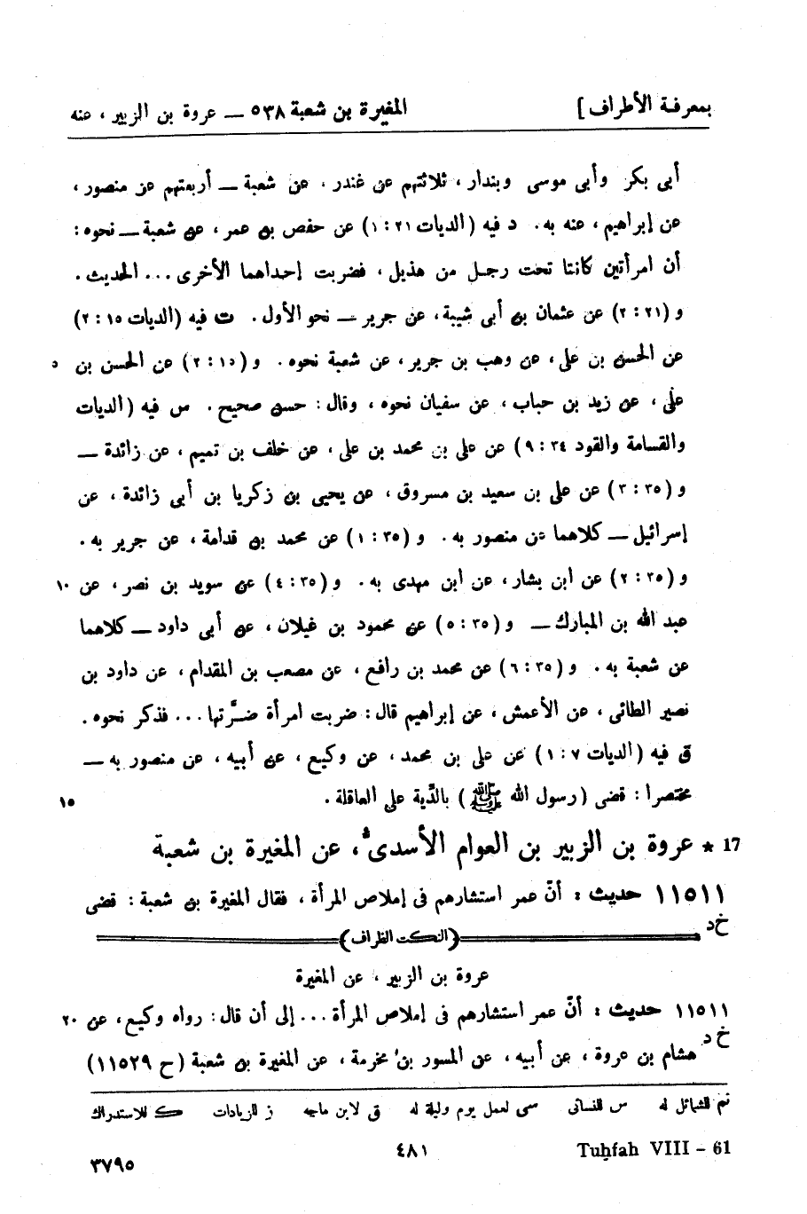 11511 -[خ د] حديث: أنّ عمر استشارهم في إملاص المرأة، فقال المغيرة بن شعبة: قضى -[482]- فيه النبيّ صَلَّى اللَّهُ عَلَيْهِ وَسَلَّمَ بغُرَّة ... الحديث. خ في الديات (25: 3) عن عبيد الله بن موسى، عن هشام بن عروة، عن أبيه به. د فيه (الديات 21: 4) عن موسى بن إسماعيل، عن وهيب، عن هشام بن عروة، عن أبيه، عن المغيرة بن شعبة: أنّ النبيّ صَلَّى اللَّهُ عَلَيْهِ وَسَلَّمَ قضى في الجنين بغرَّة. قال أبو داود: رواه حماد بن زيد وحماد بن سلمة، عن هشام، عن أبيه أنّ عمر قال ... فذكر قصة فيها: فقال المغيرة ... بهذا. وباقي طرقه في مسند محمد بن مسلمة، في ترجمة عروة بن الزبير , عنه - (ح 11231) . ز رواه وكيع [م د ق] ، عن هشام بن عروة، عن أبيه، عن المسور بن مخرمة، عن المغيرة بن شعبة (ح 11529) ومحمد بن مسلمة، وقد مضى في مسند محمد بن مسلمة، في -[483]- ترجمة المسور بن مخرمة , عنه - (ح 11233) .