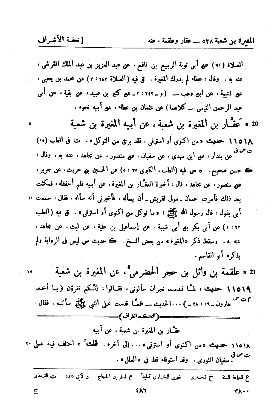 11518 -[ت س ق] حديث من اكتوى أو استرقى، فقد برئ من التوكل. ت في الطب (14) عن بندار، عن ابن مهدي، عن سفيان، عن منصور، عن مجاهد , عنه به، وقال: حسن صحيح. (ك) س فيه (الطب، الكبرى 67: 5) عن الحسين بن حريث، عن جرير، عن منصور، عن مجاهد، قال: أخبرنا العقَّار بن المغيرة، عن أبيه فلم أحفظه، فمكث بعد ذلك فأمرت حسان - مولى لقريش - أن يسأله، فأخبرني أنه سأله، فقال: سمعت أبي يقول: قال رسول الله صَلَّى اللَّهُ عَلَيْهِ وَسَلَّمَ: ما توكل من اكتوى أو استرقى. ق فيه (الطب 23: 1) عن أبي بكر بن أبي شيبة، عن إسماعيل ابن علية، عن ليث، عن مجاهد , عنه به. وسقط ذكر المغيرة من بعض النسخ. ك حديث س ليس في الرواية ولم يذكره أبو القاسم.