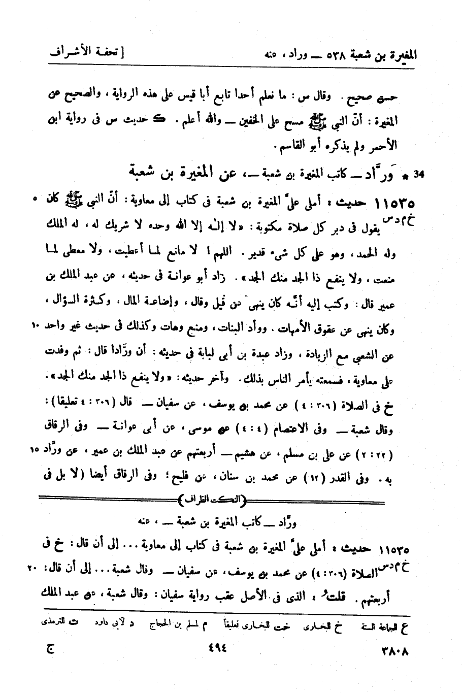 11535 -[خ م د س] حديث: أملى عليَّ المغيرة بن شعبة في كتاب إلى معاوية: أنّ النبيّ صَلَّى اللَّهُ عَلَيْهِ وَسَلَّمَ كان يقول في دبر كل صلاة مكتوبة: لا إله إلا الله وحده لا شريك له، له الملك وله الحمد، وهو على كل شيء قدير. اللهم! لا مانع لما أعطيت، ولا معطي لما منعت، ولا ينفع ذا الجد منك الجد زاد أبو عوانة في حديثه عن عبد الملك بن عمير قال: وكتب إليه أنَّه كان ينهى عن قيل وقال، وإضاعة المال، وكثرة السؤال، وكان ينهى عن عقوق الأمهات، ووأد البنات، ومنع وهات وكذلك في حديث غير واحد عن الشعبي مع الزيادة، وزاد عبدة بن أبي لبابة في حديثه: أن ورَّاداً قال: ثم وفدت على معاوية، فسمعته يأمر الناس بذلك. وآخر حديثه: ولا ينفع ذا الجد منك الجد. خ في الصلاة (306: 4) عن محمد بن يوسف، عن سفيان - قال (306: 4 تعليقاً) : وقال شعبة - وفي الاعتصام (4: 4) عن موسى، عن أبي عوانة - وفي الرقاق (22: 2) عن علي بن مسلم، عن هشيم - أربعتهم عن عبد الملك بن عمير، عن ورَّاد به. وفي القدر (12) عن محمد بن سنان، عن فليح؛ وفي الرقاق أيضاً (لا بل في -[495]- القدر 12 تعليقاً) : وقال ابن جريج؛ كلاهما عن عبدة بن أبي لبابة - وفيه أيضاً (الرقاق 22: 1) عن علي بن مسلم، عن هشيم، قال: أخبرنا غير واحد، منهم مغيرة وفلان ورجل ثالث، عن الشعبي - وفي الدعوات (18: 2) عن قتيبة، عن جرير، عن منصور، عن المسيب بن رافع - (قال - 18: 2 تعليقاً - وقال شعبة، عن منصور، قال: سمعت المسيب) - وفي الصلاة (306: 4 تعليقاً) : وقال الحكم، عن القاسم بن مخيمرة - أربعتهم عن ورَّاد به. م في الصلاة (79: 5) عن إسحاق بن إبراهيم، عن جرير به. و (79: 6) عن أبي بكر وأبي كريب وأحمد بن سنان، ثلاثتهم عن أبي معاوية، عن الأعمش، عن المسيب بن رافع به. و (79: 7) عن محمد بن حاتم، عن محمد بن بكر، عن ابن جريج به. و (79: 9) عن ابن أبي عمر، عن سفيان بن عيينة، عن عبدة بن أبي لبابة وعبد الملك بن عمير به. و (79: 8) عن حامد بن عمر، عن بشر بن المفضل - و (79: 8) عن محمد بن المثنى، عن أزهر بن سعد - كلاهما عن ابن عون، عن أبي سعيد، عن ورَّاد به. قال أبو مسعود: أبو سعيد الذي روى , عنه ابن عون لا يعرف اسمه، وقال غيره: اسمه عبد ربه. وقال أبو بكر بن -[496]- منجويه: أظنُّه عمرو بن سعيد القرشي؛ ويقال: الثقفي. د فيه (الصلاة 361: 1) عن مسدد، عن أبي معاوية نحوه. س فيه (الصلاة 538: 1) عن محمد بن منصور، عن سفيان بن عيينة نحوه. و (539) عن يعقوب بن إبراهيم، عن هشيم، عن غير واحد، منهم مغيرة، عن الشعبي نحوه. وفيه (الصلاة 538: 2) وفي اليوم والليلة (؟) عن محمد بن قدامة، عن جرير به. و (الصلاة 539، واليوم والليلة 51: 1) عن الحسن بن إسماعيل بن سليمان، عن هشيم، قال: أخبرنا مغيرة وذكر آخر، عن الشعبي نحوه.