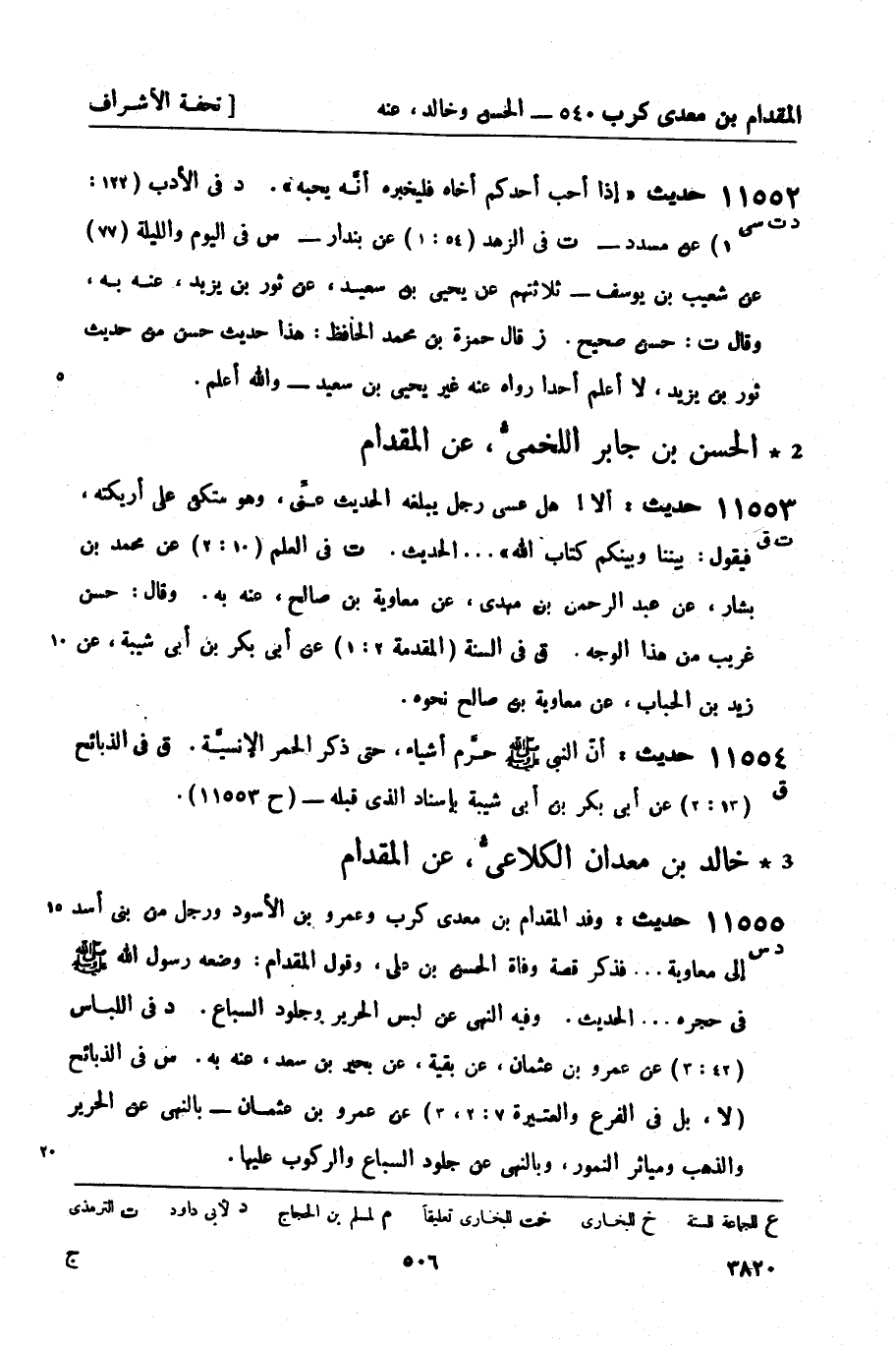 11552 -[د ت سي] حديث إذا أحب أحدكم أخاه فليخبره أنَّه يحبه. د في الأدب (122: 1) عن مسدد - ت في الزهد (54: 1) عن بندار - س في اليوم والليلة (77) عن شعيب بن يوسف - ثلاثتهم عن يحيى بن سعيد، عن ثور بن يزيد، عنه به. وقال ت: حسن صحيح. ز قال حمزة بن محمد الحافظ: هذا حديث حسن من حديث ثور بن يزيد، لا أعلم أحداً رواه عنه غير يحيى بن سعيد - والله أعلم.