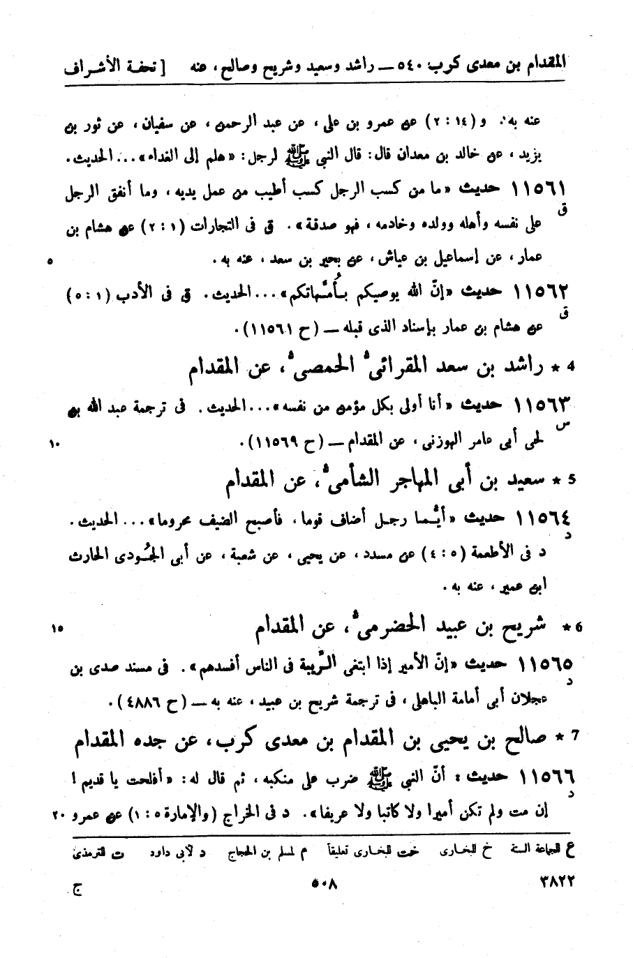 11566 -[د] حديث: أنّ النبيّ صَلَّى اللَّهُ عَلَيْهِ وَسَلَّمَ ضرب على منكبه، ثم قال له: أفلحت يا قديم! إن مت ولم تكن أميراً ولا كاتباً ولا عريفاً د في الخراج (والإمارة 5: 1) عن عمرو -[509]- بن عثمان، عن محمد بن حرب، عن أبي سلمة سليمان بن سليم، عن يحيى بن جابر، عن صالح بن يحيى بن المقدام بن معدي كرب، عن جده المقدام به. وفي بعض النسخ: عن أبيه، عن جده.