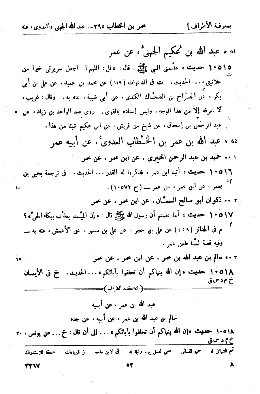 10517 -[م] حديث: أما علمتم أن رسول الله صَلَّى اللَّهُ عَلَيْهِ وَسَلَّمَ قال: إن الميِّت يعذَّب ببكاء الحيِّ؟ (م) في الجنائز (9: 4) عن علي بن حجر، عن علي بن مسهر، عن الأعمش، عنه به. - وفيه قصة لمَّا طعن عمر.