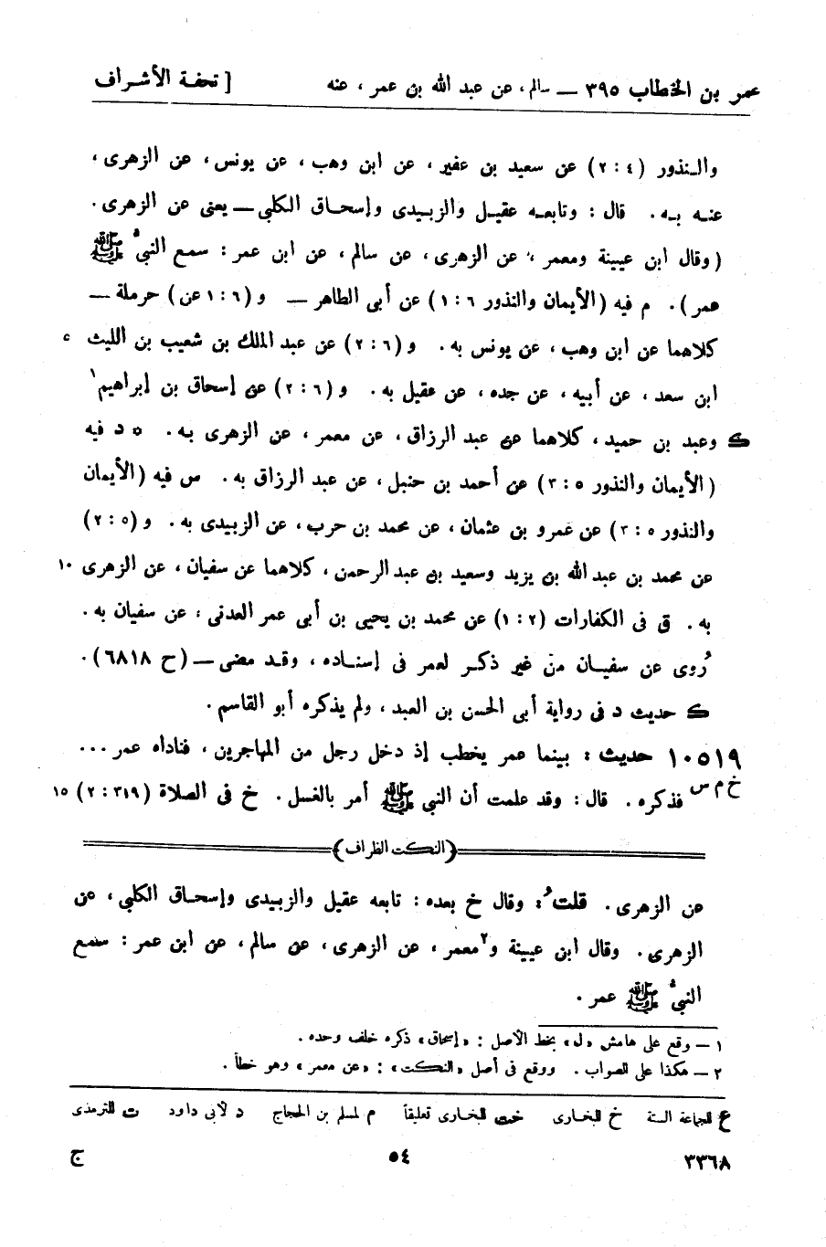 س فيه (الصلاة، الكبرى 722: 3) عن كثير بن عبيد، عن محمد بن حرب، عن الزبيدي، عن الزهري به. - مختصراً: أن النبيّ صَلَّى اللَّهُ عَلَيْهِ وَسَلَّمَ قال: من جاء منكم الجمعة فليغتسل. ثم أخرجه بهذا الإسناد فجعله من مسند ابن عمر عن النبيّ صَلَّى اللَّهُ عَلَيْهِ وَسَلَّمَ - ولم يذكر عمر في إسناده - (ح 6929) .