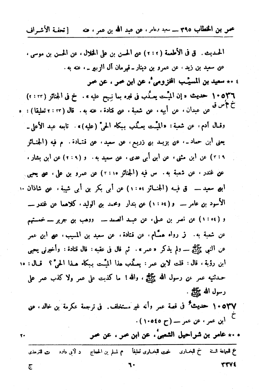 ق فيه (الجنائز 54: 1) عن أبي بكر بن أبي شيبة، عن شاذان الأسود بن عامر - و (54: 1) عن بندار ومحمد بن الوليد، كلاهما عن غندر - و (54: 1) عن نصر بن علي، عن عبد الصمد - ووهب بن جرير - خمستهم عن شعبة به. (ز) رواه همَّام، عن قتادة، عن سعيد بن المسيب، عن ابن عمر عن النبيّ صَلَّى اللَّهُ عَلَيْهِ وَسَلَّمَ - ولم يذكر عمر. ثم قال في عقبة: قال قتادة: وأخبرني يحيى بن رؤبة، قال: قلت لابن عمر: يعذَّب هذا الميِّت ببكاء هذا الحيِّ؟ قال: حدثنيه عمر عن رسول الله صَلَّى اللَّهُ عَلَيْهِ وَسَلَّمَ، والله! ما كذبت على عمر ولا كذب عمر على رسول الله صَلَّى اللَّهُ عَلَيْهِ وَسَلَّمَ.،