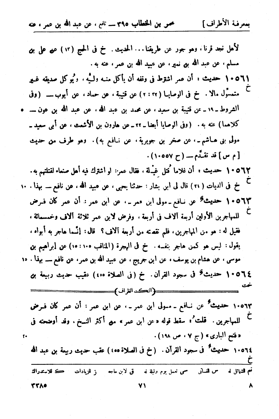 10561 -[خ] حديث: أن عمر اشترط في وقفه أن يأكل منه وليُّه، ويُوكل صديقه غير متموِّل مالاً. (خ) في الوصايا (32: 2) عن قتيبة، عن حماد، عن أيوب - (وفي الشروط - 19 - عن قتيبة بن سعيد، عن محمد بن عبد الله، عن عبد الله بن عون - كلاهما) , عنه به. (وفي الوصايا أيضاً - 22 - عن هارون بن الأشعث، عن أبي سعيد - مولى بني هاشم -، عن صخر بن جويرية، عن نافع به.) . وهو طرف من حديث [م س] قد تقدَّم - (ح 10557) .