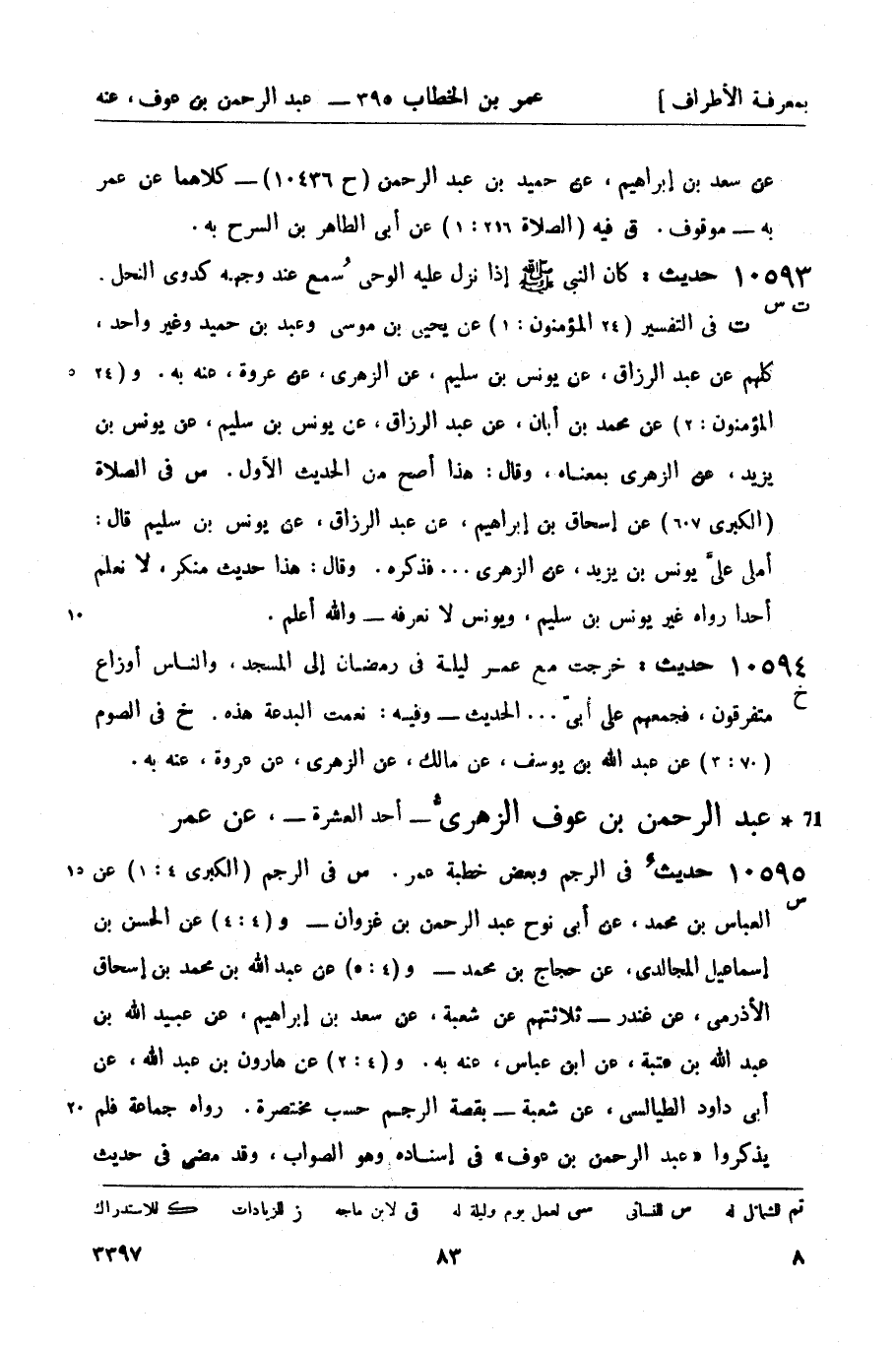 10595 -[س] حديثٌ في الرجم وبعض خطبة عمر. (س) في الرجم (الكبرى 4: 1) عن العباس بن محمد، عن أبي نوح عبد الرحمن بن غزوان - و (4: 4) عن الحسن بن إسماعيل المجالدي، عن حجاج بن محمد - و (4: 5) عن عبد الله بن محمد بن إسحاق الأذرمي، عن غندر - ثلاثتهم عن شعبة، عن سعد بن إبراهيم، عن عبيد الله بن عبد الله بن عتبة، عن ابن عباس، عنه به. و (4: 2) عن هارون بن عبد الله، عن أبي داود الطيالسي، عن شعبة - بقصة الرجم حسب مختصرة. رواه جماعة فلم يذكروا عبد الرحمن بن عوف في إسناده وهو الصواب، وقد مضى في حديث -[84]- السقيفة (ح 10508) (ز) وروى عن سعيد بن أبي هند، عن عبيد الله بن عبد الله، عن عمر - مرسل، وسيأتي - (ح 10599) .