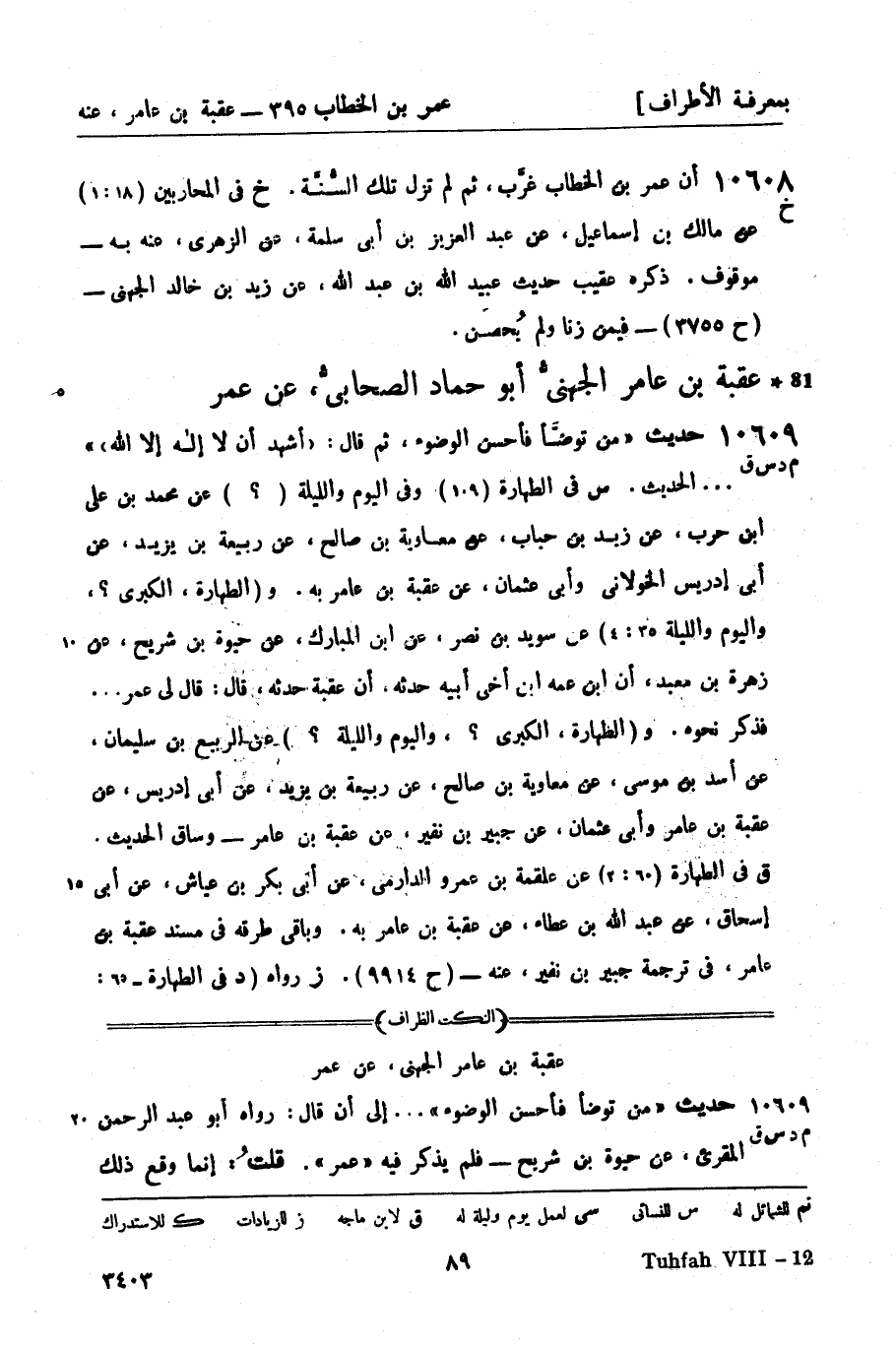 س في الطهارة (109) وفي اليوم والليلة (؟) عن محمد بن علي بن حرب، عن زيد بن حباب، عن معاوية بن صالح، عن ربيعة بن يزيد، عن أبي إدريس الخولاني، وأبي عثمان، عن عقبة بن عامر به. و (الطهارة، الكبرى؟، واليوم والليلة 35: 4) عن سويد بن نصر، عن ابن المبارك، عن حيوه بن شريح، عن زهرة بن معبد، أن ابن عمه ابن أخي أبيه حدثه، أن عقبة حدثه، قال: قال لي عمر ... فذكر نحوه. و (الطهارة، الكبرى؟، واليوم والليلة؟) عن الربيع بن سليمان، عن أسد بن موسى، عن معاوية بن صالح، عن ربيعة بن يزيد، عن أبي إدريس، عن عقبة بن عامر وأبي عثمان، عن جبير بن نفير، عن عقبة بن عامر - وساق الحديث. ق في الطهارة (60: 2) عن علقمة بن عمرو الدارمي، عن أبي بكر بن عياش، عن أبي إسحاق، عن عبد الله بن عطاء، عن عقبة بن عامر به. وباقي طرقه في مسند عقبة بن عامر، في ترجمة جبير بن نفير، عنه - (ح 9914) . (ز) رواه (د في الطهارة -[90]- 65: 2 - عن الحسين بن عيسى، ثنا) أبو عبد الرحمن المقرئ، عن حيوه بن شريح - فلم يذكر فيه عمر - (ح 9974) . وقال أبو داود الطيالسي، عن شعبة: سألنا أبا إسحاق عن عبد الله بن عطاء الذي روى عن عقبة: كنا نتناوب رعية الإبل؟ فقال: شيخ من أهل الطائف حدثنيه. قال شعبة: فلقيت عبد الله بن عطاء فقلت: سمعته من عقبة؟ قال لا، حدثنيه سعد بن إبراهيم، فلقيت سعداً فسألته؟ فقال: حدثني زياد بن مخراق، فلقيت زياد بن مخراق فسألته؟ فقال: حدثني رجل، عن شهر بن حوشب - يعني عن عقبة بن عامر.