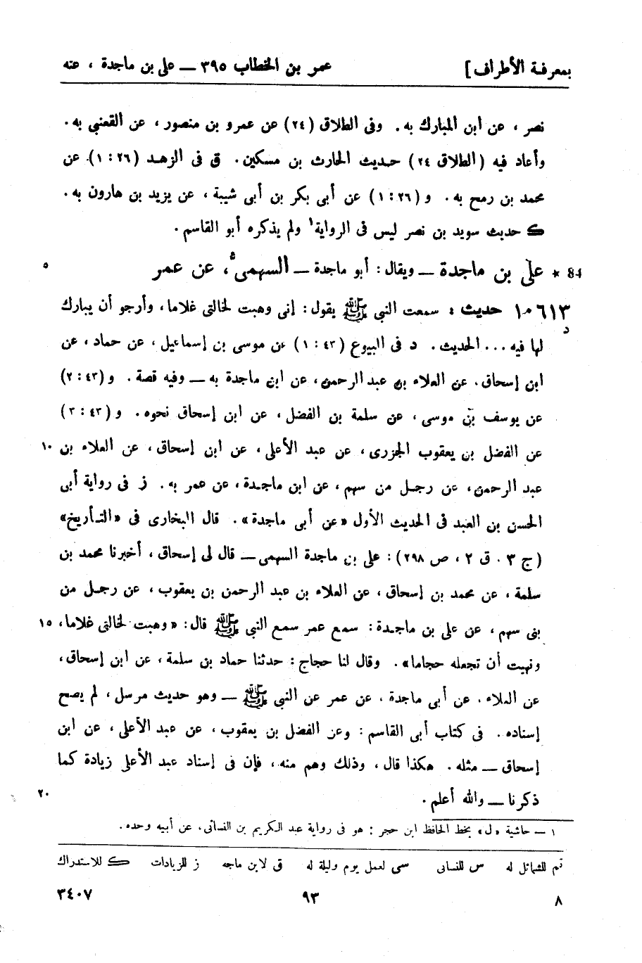 د في البيوع (43: 1) عن موسى بن إسماعيل، عن حماد، عن ابن إسحاق، عن العلاء بن عبد الرحمن، عن ابن ماجدة به - وفيه قصة و (43: 2) عن يوسف بن موسى، عن سلمة بن الفضل، عن ابن إسحاق نحوه. و (43: 3) عن الفضل بن يعقوب الجزري، عن عبد الأعلى، عن ابن إسحاق , عن العلاء بن عبد الرحمن , عن رجل من سهم , عن ابن ماجدة , عن عمر به. ز في رواية أبي الحسن بن العبد في الحديث الأول عن أبي ماجدة قال البخاري في التأريخ (ج 3 ق 2 ص 298) علي بن ماجدة السهمي قال لي إسحاق، أخبرنا محمد بن سلمة , عن محمد بن إسحاق , عن العلاء بن عبد الرحمن بن يعقوب، عن رجل من بني سهم عن علي بن ماجدة: سمع عمر سمع النبيّ صَلَّى اللَّهُ عَلَيْهِ وَسَلَّمَ قال: وهبت لخالتي غلاماً، ونهيت أن تجعله حجاماً. وقال لنا حجاج: حدثنا حماد بن سلمة , عن ابن إسحاق , عن العلاء , عن أبي ماجدة , عن عمر عن النبيّ صَلَّى اللَّهُ عَلَيْهِ وَسَلَّمَ - وهو حديث مرسل، لم يصح إسناده. في كتاب أبي القاسم: وعن الفضل بن يعقوب , عن عبد الأعلى , عن ابن إسحاق - مثله. هكذا قال، وذلك وهم منه، فإن في إسناد عبد الأعلى زيادة كما ذكرنا - والله أعلم.