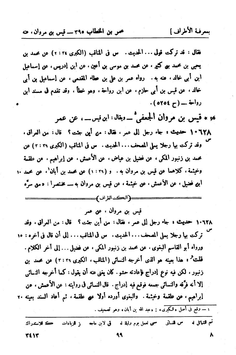 س في المناقب (الكبرى 36: 3) عن محمد بن زنبور المكي، عن فضيل بن عياض، عن الأعمش، عن إبراهيم، عن علقمة وخيثمة، كلاهما عن قيس بن مروان به. و (36: 1) عن محمد بن أبان 1، عن محمد بن فضيل، عن الأعمش، عن خيثمة، عن قيس بن مروان به. مختصراً: من سرَّه -[100]- أن يقرأ القرآن غضَّاً إلى آخره. رواه سفيان الثوري وأبو معاوية، عن الأعمش، عن إبراهيم، عن علقمة، عن عمر، وقد مضى - (ح 10611) . ورواه الحسن بن عبيد الله، عن إبراهيم، عن علقمة، عن قرثع الضبي، عن رجل من جعفي - يقال له: قيس أو ابن قيس -، عن عمر. ز ورواه عبد العزيز بن أبان القرشي، عن حبيب بن حسان الأسدي، عن عمارة بن عمير، عن قيس بن مروان، عن عمر - مختصراً. ورواه أبو القاسم البغوي، عن محمد بن زنبور المكي، عن فضيل بن عياض، عن -[101]- الأعمش، عن إبراهيم، عن عقلمة، عن عمر - مختصراً. وعن ابن زنبور، عن فضيل، عن الأعمش، عن خيثمة، عن قيس بن مروان، عن عمر - مثله.