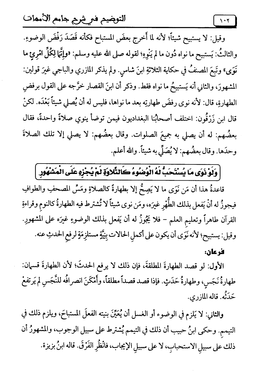 والثاني: لا يَلزم في الوضوء أو الغسل أن يُعَيِّنَ بنيته الفعلَ المستباحَ، ويلزم ذلك في التيممِ. وحكى ابنُ حبيب أن ذلك في التيمم يُشترط على سبيل الوجوب، والْمَشْهُورِ أن ذلك على سبيلِ الاستحبابِ، لا على سبيلِ الإيجاب، فانْظُرِ الفَرْقَ. قال ابنُ بزيزة.