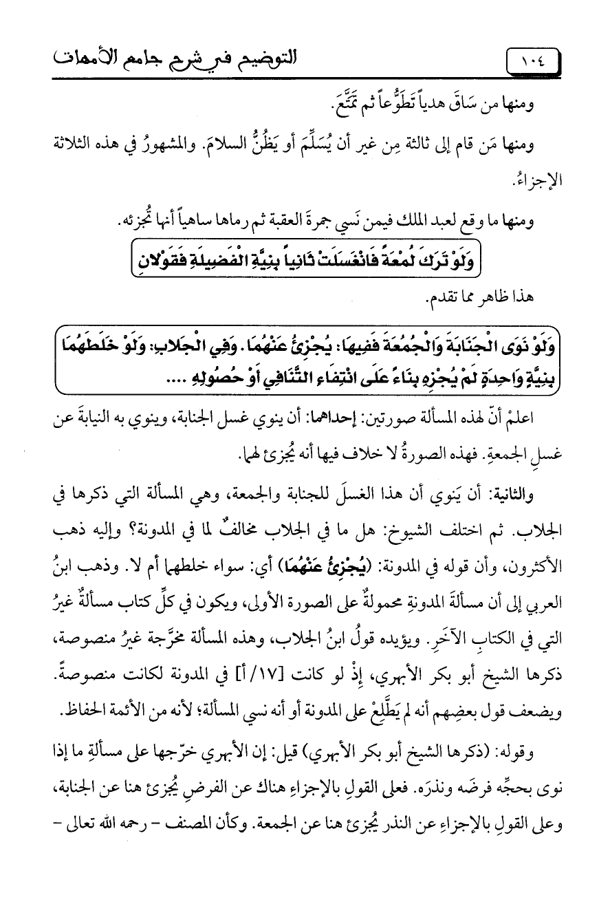 والثانية: أن يَنوي أن هذا الغسلَ للجنابة والجمعة، وهي المسألة التي ذكرها في الجلاب. ثم اختلف الشيوخ: هلا ما في الجلاب مخالفٌ لما في المدونة؟ وإليه ذهب الأكثرون، وأن قوله في المدونة: (يُجْزِئُ عَنْهُمَا) أي: سواء خلطهما أم لا. وذهب ابنُ العربي إلى أن مسألةَ المدونةِ محمولةٌ على الصورة الأولى، ويكون في كلِّ كتاب مسألةٌ غيرُ التي في الكتابِ الآخَرِ. ويؤيده قولُ ابنُ الجلاب، وهذ المسألة مخرَّجة غيرُ منصوصة، ذكرها الشيخ أبو بكر الأبهري، إِذْ لو كانت [17/أ] في المدونة لكانت منصوصةً. ويضعف قول بعضهم أنه لم يَطَّلِعْ على المدونة أو أنه نسي المسألة؛ لأنه من الأئمة الحفاظ.