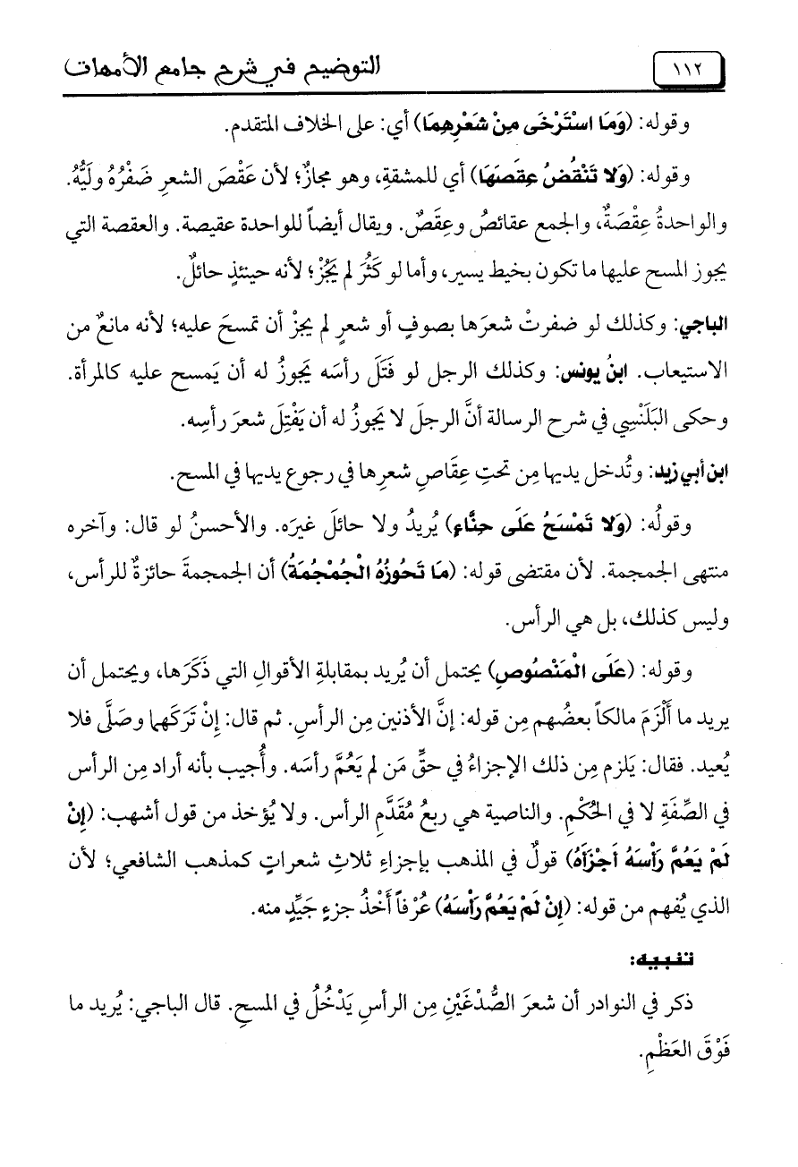 وقولُه: (وَلا تَمْسَحُ عَلَى حِنَّاءٍ) يُريدُ ولا حائلَ غيرَه. والأحسنُ لو قال: وآخره منتهى الجمجمة. لأن مقتضى قوله: (مَا تَحُوزُهُ الْجُمْجُمَةُ) أن الجمجمةَ حائزةٌ للرأس، وليس كذلك، بل هي الرأس.