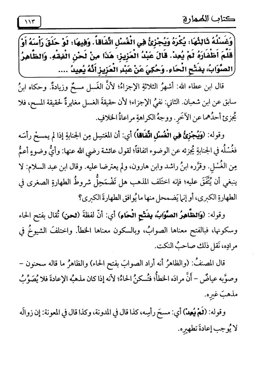 وَغَسْلُهُ ثَالِثُهَا: يُكْرَهُ وَيُجْزِئُ فِي الْغُسْلِ اتِّفَاقاً. وَفِيهَا: لَوْ حَلَقَ رَاسَهُ أَوْ قَلَّمَ أَظفَارَهُ لمَ يُعِدْ قَالَ عَبْدُ الْعَزِيزِ: هَذَا مِنْ لَحْنِ الْفِقْهِ. وَالظَّاهِرُ الصَّوَابُ، بِفَتْحِ الْحَاءِ. وَحُكِيَ عَنْ عَبْدِ الْعَزِيزِ أَنَّهُ يُعيد ...