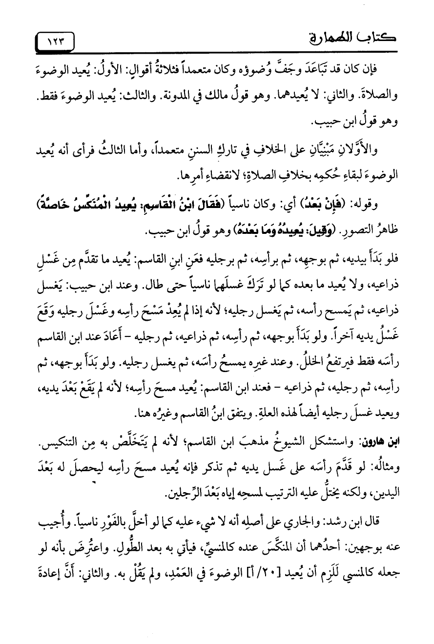 ابن هارون: واستشكل الشيوخُ مذهبَ ابن القاسم؛ لأنه لم يَتَخَلَّصْ به مِن التنكيس. ومثالُه: لو قَدَّمَ رأسَه على غَسل يديه ثم تذكر فأنه يُعيد مسحَ رأسِه ليحصلَ له بَعْدَ اليدين, ولكنه يختلُّ عليه الترتيب لمسحِه إياه بَعْدَ الرِّجلين.