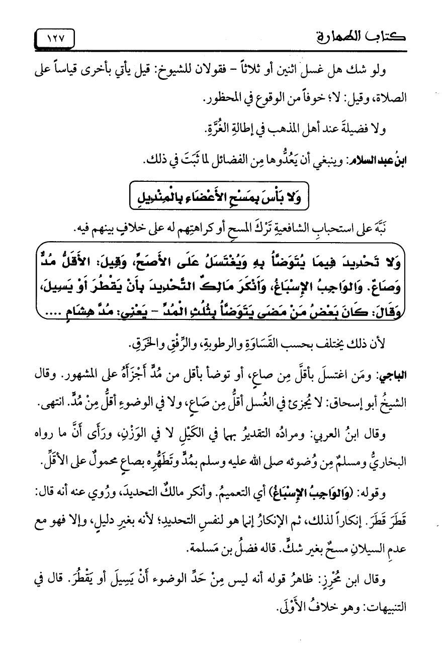 وَلا تَحْدِيدَ فِيمَا يُتَوَضَّأُ بهِ وَيُغْتَسَلُ عَلَى الأَصَحِّ, وَقِيلَ: الأَقَلُّ مُدٌّ وَصَاعٌ. وَالوَاجِبُ الإِسْبَاغُ, وَأَنْكَرَ مَالِكٌ التَّحْدِيدَ بأنْ يَقْطُرَ أَوْ يَسِيلَ, وَقَالَ: كَانَ بَعْضُ مِنْ مَضَى يَتَوَضَّأُ بِثُلُثِ الْمُدِّ- يَعْنِي: مُدَّ هِشَامٍ ...