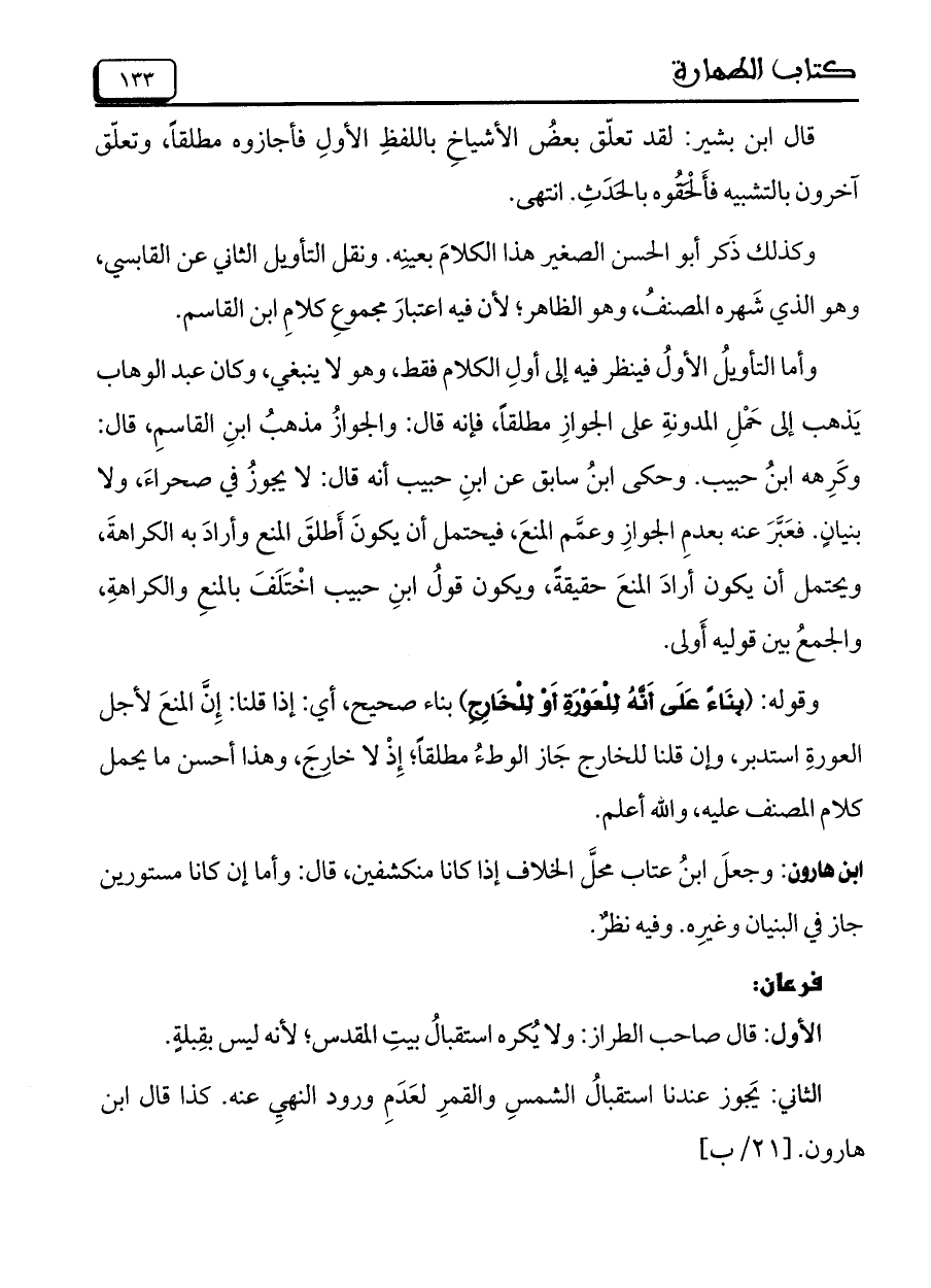 وأما التأويلُ الأولُ فينظر فيه إلى أولِ الكلام فقط، وهو لا ينبغي، وكان عبد الوهاب يَذهب إلى حَمْلِ المدونةِ على الجوازِ مطلقاً، فإنه قال: والجوازُ مذهبُ ابنِ القاسمِ، قال: وكَرِهه ابنُ حبيب. وحكى ابنُ سابق عن ابنِ حبيب أنه قال: لا يجوزُ في صحراءَ، ولا بنيانٍ. فعَبَّرَ عنه بعدمِ الجوازِ وعمّم المنعَ، فيحتمل أن يكونَ أَطلقَ المنع وأرادَ به الكراهةَ، ويحتمل أن يكون أرادَ المنعَ حقيقةً، ويكون قولُ ابنِ حبيب اخْتَلَفَ بالمنعِ والكراهةِ، والجمعُ بين قوليه أَولى.