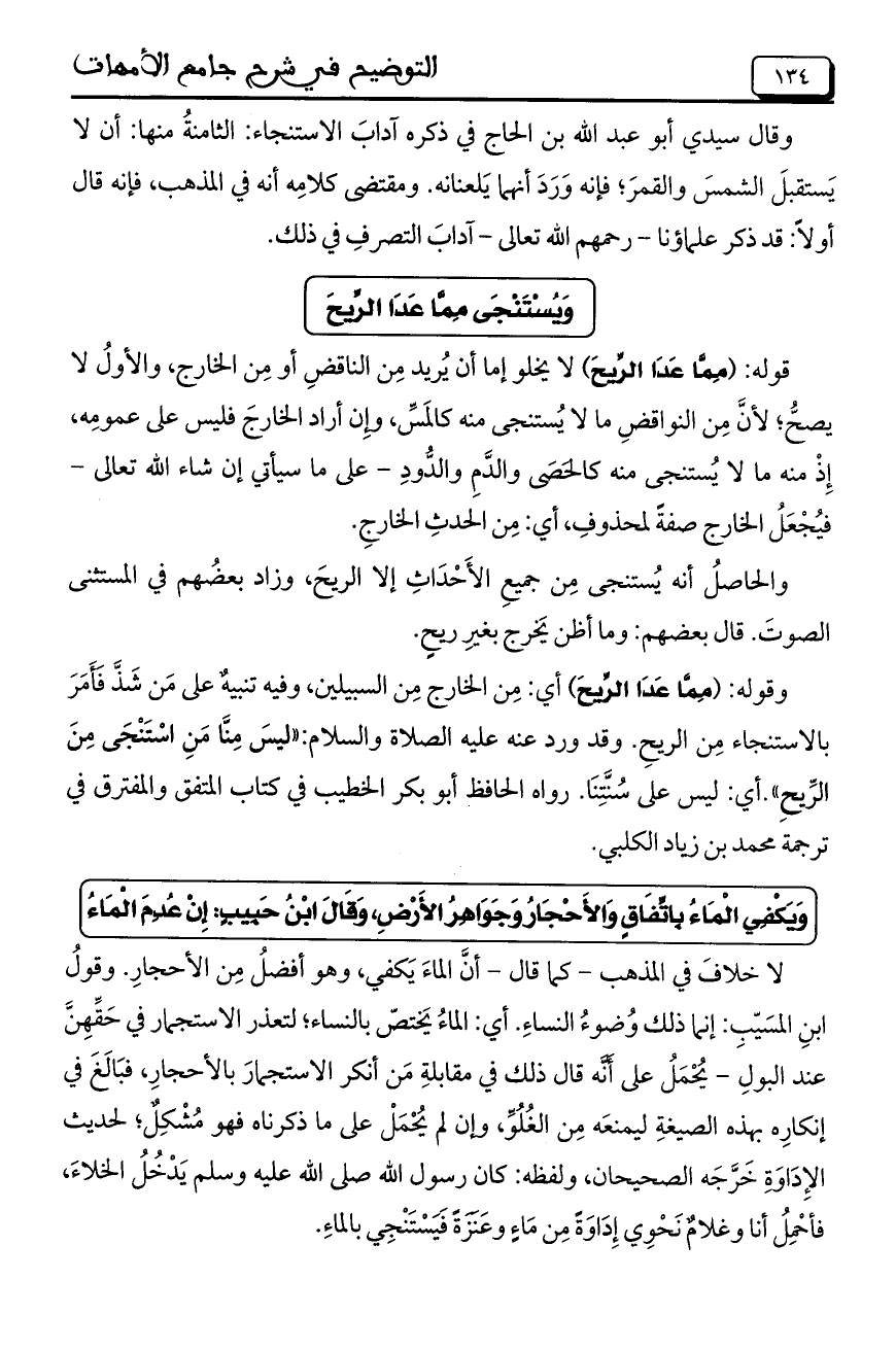 وقوله: (مِمَّا عَدَا الرِّيحَ) أي: مِن الخارج مِن السبيلين، وفيه تنبيهٌ على مَن شَذَّ فَأَمَرَ بالاستنجاء مِن الريحِ. وقد ورد عنه عليه الصلاة والسلام: "ليسَ مِنَّا مَنِ اسْتَنْجَى مِنَ الرِّيحِ". أي: ليس على سُنَّتِنَا. رواه الحافظ أبو بكر الخطيب في كتاب المتفق والمفترق في ترجمة محمد بن زياد الكلبي.