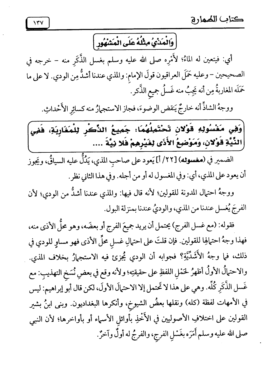 فقوله: (مع غسل الفرج) يحتمل أن يريد جميعَ الفرج أو بعضَه، وهو محلُّ الأذى منه، فهذا وجهُ احتمالِها للقولين. فإن قلتَ على احتمالِ غسلِ محلِّ الأذى فهو مساوٍ للودي في ذلك، فما وجهُ الأَشَدِّيَّةِ؟ فجوابه أن الودي يُجزئ فيه الاستجمارُ بخلاف المذي. والاحتمالُ الأولُ أظهرُ لحَمْلِ اللفظِ على حقيقتِه؛ ولأنه وقع في بعض نُسَخِ التهذيبِ: مع غَسل الذَّكَرِ كُلِّه. وهي على هذا لا تَحتمل إلا الاحتمالَ الأولَ، لكن قال أبو إبراهيم: ليس في الأمهات لفظة (كله) ونقلها بعضُ الشيوخِ، وأنكرها البغداديون. وبنى ابنُ بشير القولين على اختلافِ الأصوليين في الأَخْذِ بأوائلِ الأسماء أو بأواخرها؛ لأن النبي صلى الله عليه وسلم أَمَرَه بغَسْلِ الفرجِ، والفرجُ له أولٌ وآخرٌ.