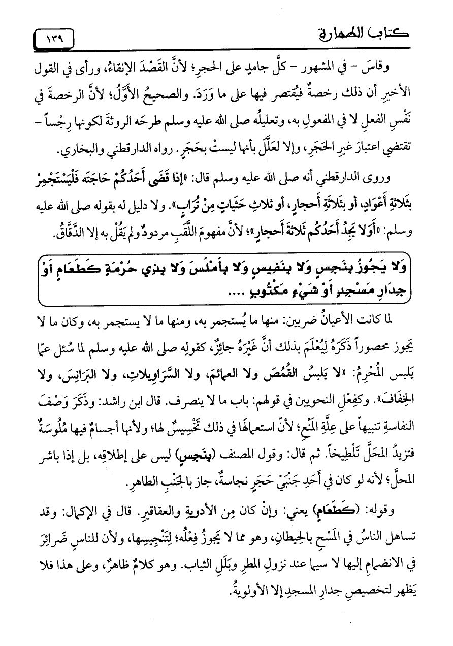 وقاسَ- في الْمَشْهُورِ- كلَّ جامدٍ على الحجرِ؛ لأنَّ القَصْدَ الإنقاءُ، ورأى في القول الأخيرِ أن ذلك رخصةٌ فيُقتصر فيها على ما وَرَدَ. والصحيحُ الأَوَّلُ؛ لأنَّ الرخصةَ في نَفْسِ الفعلِ لا في المفعولِ به، وتعليلُه صلى الله عليه وسلم طرحَه الروثةَ لكونها رِجْساً- تقتضي اعتبارَ غيرِ الحَجَرِ، وإلا لعَلَّلَ بأنها ليستْ بحَجَرٍ. رواه الدارقطني والبخاري.