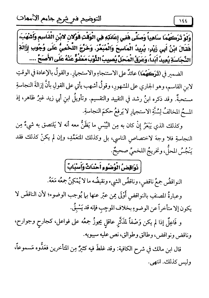الضمير في (تَرَكَهُمَا) عائدٌ على الاستنجاءِ والاستجمارِ. والقولُ بالإعادة في الوقت لابنِ القاسم, وهو الجاري على الْمَشْهُورِ, وقولُ أشهب يأتي على القولِ بأنَّ إزالةَ النجاسةِ مستحبةٌ. وقد ذكره ابنُ رشد فى التقييد والتقسيم. وتأويلُ ابنِ أبي زيد غيرُ ظاهر, إذ المسحُ المخالفُ لِسُنَّةِ الاستجمارِ لا يَرفعُ حكمَ النجاسةِ.