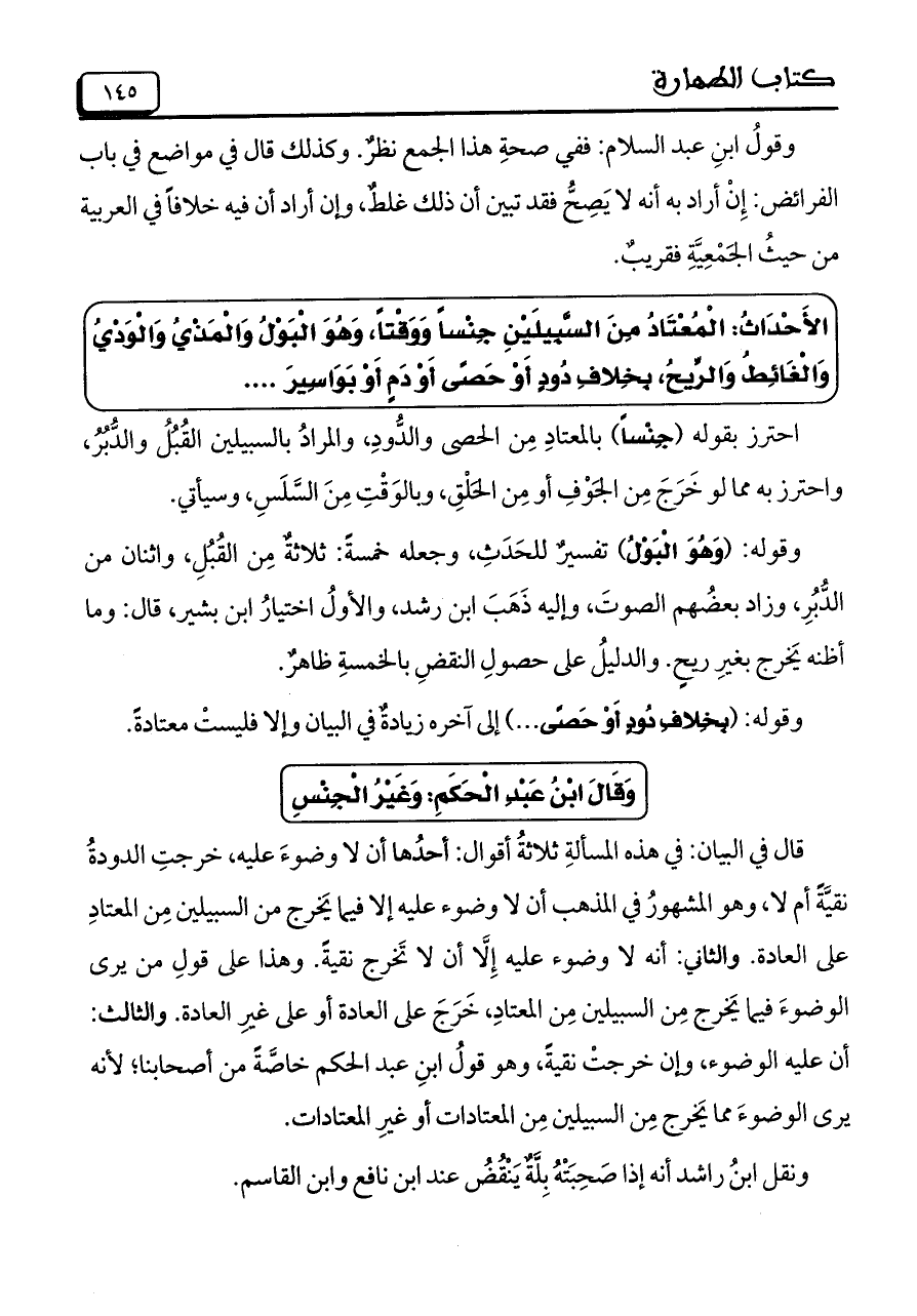 احترز بقوله (جِنْساً) بالمعتادِ مِن الحصى والدُّودِ, والمرادُ بالسبيلين القُبُلُ والدُّبُرُ, واحترز به مما لو خَرَجَ مِن الجَوْفِ أو مِن الحَلْقِ, وبالوَقْتِ مِنَ السَّلَسِ, وسيأتى.