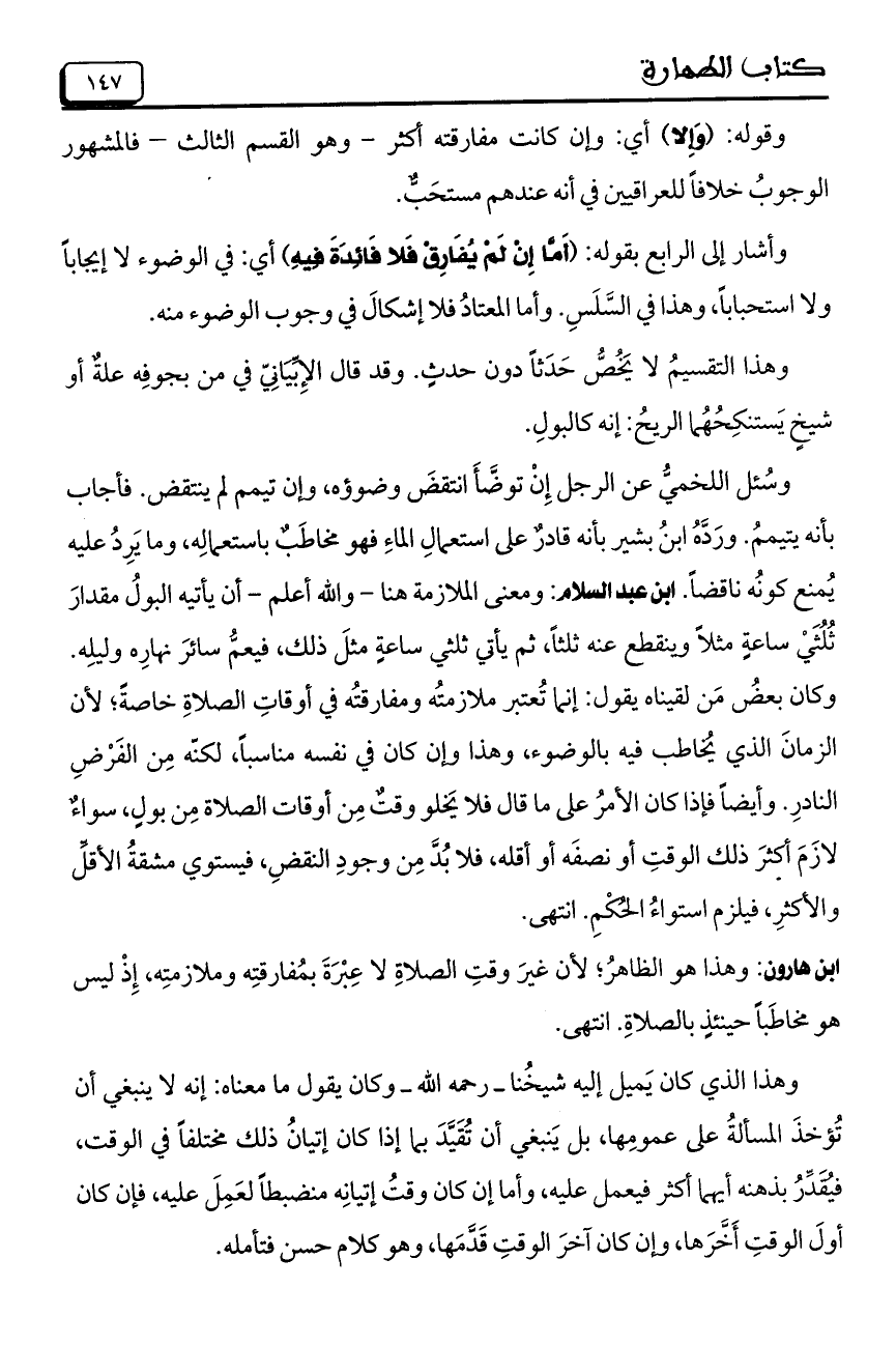 وسُئل اللخميُّ عن الرجل إِنْ توضَّأَ انتقضَ وضوؤه, وإن تيمم لم ينتقض. فأجاب بأنه يتيممُ. ورَدَّهُ ابنُ بشير بأنه قادرٌ على استعمالِ الماءِ فهو مخاطَبٌ باستعمالِه, وما يَرِدُ عليه يُمنع كونُه ناقضاً. ابن عبد السلام: ومعنى الملازمة هنا –والله أعلم- أن يأتيه البولُ مقدارَ ثُلُثَيْ ساعةٍ مثلاً وينقطع عنه ثلثاً, ثم يأتى ثلثي ساعةٍ مثلَ ذلك, فيعمُّ سائرَ نهارِه وليلِه. وكان بعضُ مَن لقيناه يقول: إنما تُعتير ملازمتُه ومفارقتُه فى أوقاتِ الصلاةِ خاصةً؛ لأن الزمانَ الذى يُخاطب فيه بالوضوء, وهذا وإن كان فى نفسه مناسباً, لكنّه مِن الفَرْضِ النادِر. وأيضاً فإذا كان الأمرُ على ما قال فلا يَخلو وقتٌ مِن أوقات الصلاة مِن بولٍ, سواءٌ لازَمَ أكثرَ ذلك الوقتِ أو نصفَه أو أقله, فلا بُدَّ مِن وجودِ النقضِ, فيستوي مشقةُ الأقلِّ والأكثرِ, فيلزم استواءُ الحُكْمِ. انتهى.