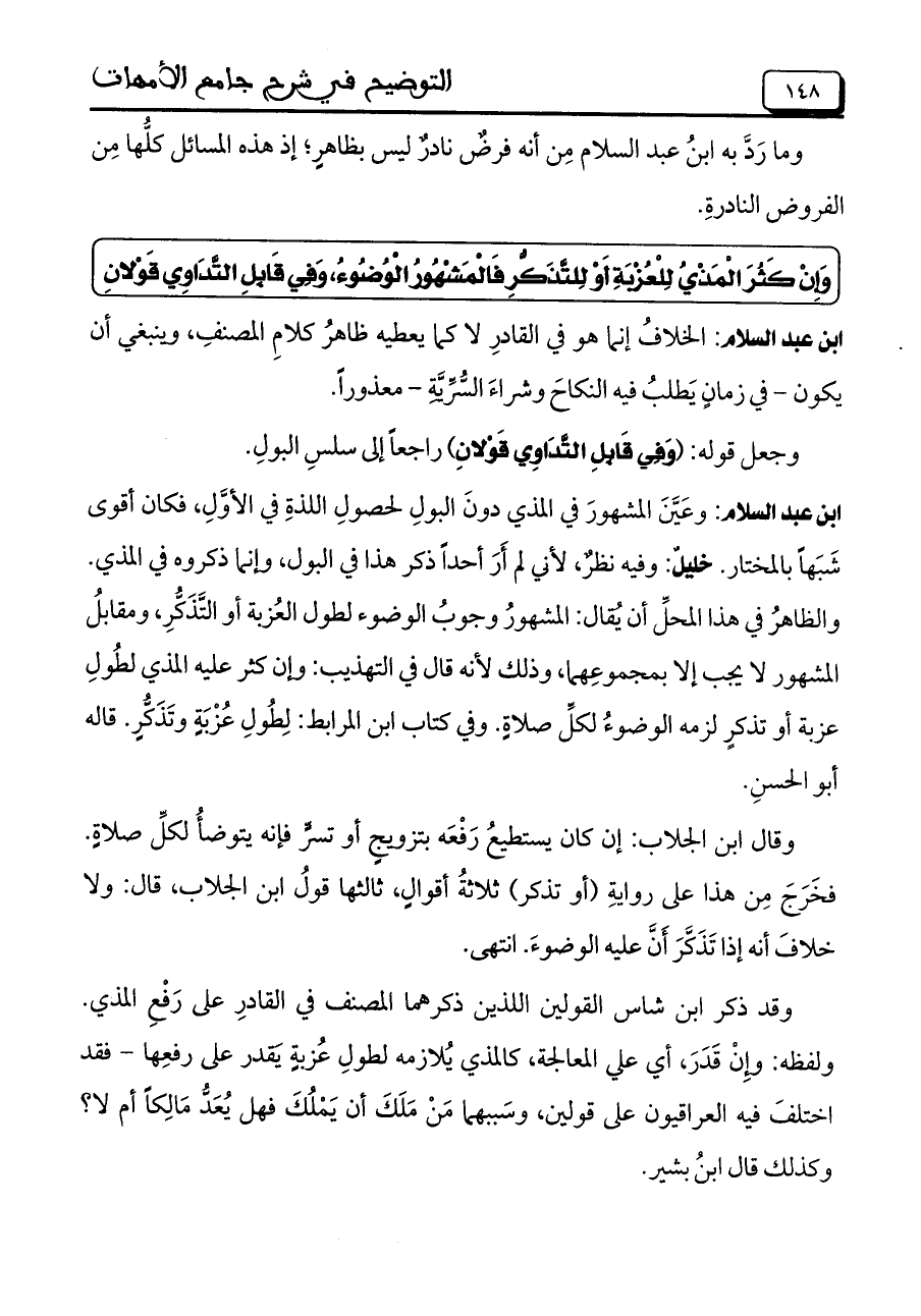 ابن عبد السلام: وعَيَّنَ الْمَشْهُورِ في المذي دونَ البولِ لحصولِ اللذةِ فى الأوَّلِ, فكان أقوى شَبَهاً بالمختار. خليل: وفيه نظرٌ, لأنى لم أَرَ أحداً ذكر هذا في البول, وإنما ذكروه في المذي. والظاهرُ في هذا المحلُ أن يُقال: الْمَشْهُورِ وجوبُ الوضوء لطول العُزبة أو التَّذَكُّرِ, ومقابلُ الْمَشْهُورِ لا يجب إلا بمجموعِهما, وذلك لأنه قال فى التهذيب: وإن كثر عليه المذي لطُولِ عزية أو تذكرٍ لزمة الوضوءُ لكلِّ صلاةٍ. وفى كتاب ابن المرابط: لِطُولِ عُزْبَةٍ وتَذَكُّرٍ. قاله أبو الحسنِ.