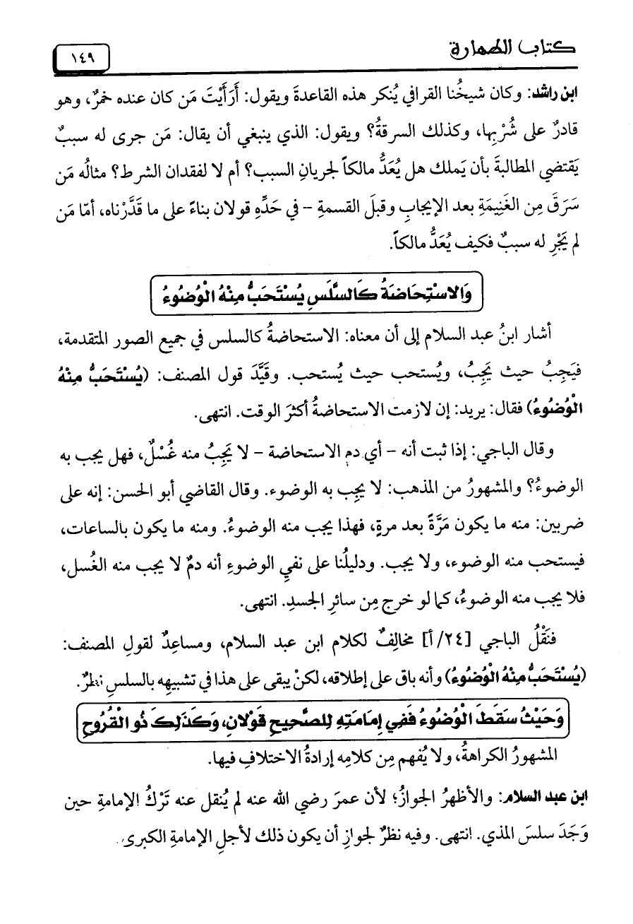 أشار ابنُ عبد السلام إلى أن معناه: الاستحاضةُ كالسلس في جميع الصور المتقدمة, فيَجِبُ حيث يَجِبُ, ويُستحب حيث يُستحب. وقَيَّدَ قول المصنف: (يُسْتَحَبُّ مِنْهُ الْوُضُوءُ) فقال: يريد: إن لازمت الاستحاضةُ أكثرَ الوقت. انتهى.