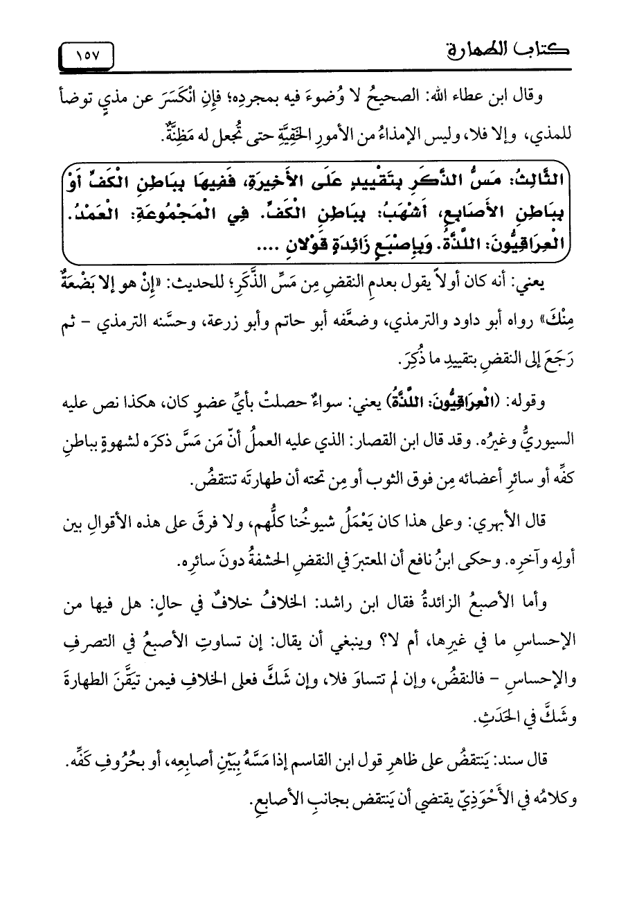 الثَّالِثُ: مَسُّ الذَّكَرِ بِتَقْييدٍ عَلَى الأَخِيرَة، فَفِيهَا ببَاطِنِ الْكَفِّ أَوْ بِبَاطِنِ الأَصَابِعِ، أَشْهَبُ: بِبَاطِنِ الْكَفِّ. فِي الْمَجْمُوعةِ: الْعَمْدُ. الْعِرَاقِيُّونَ: اللَّذَّّةُ. وَبِإِصْبَعٍ زَائِدَةٍ قَوْلانِ ....