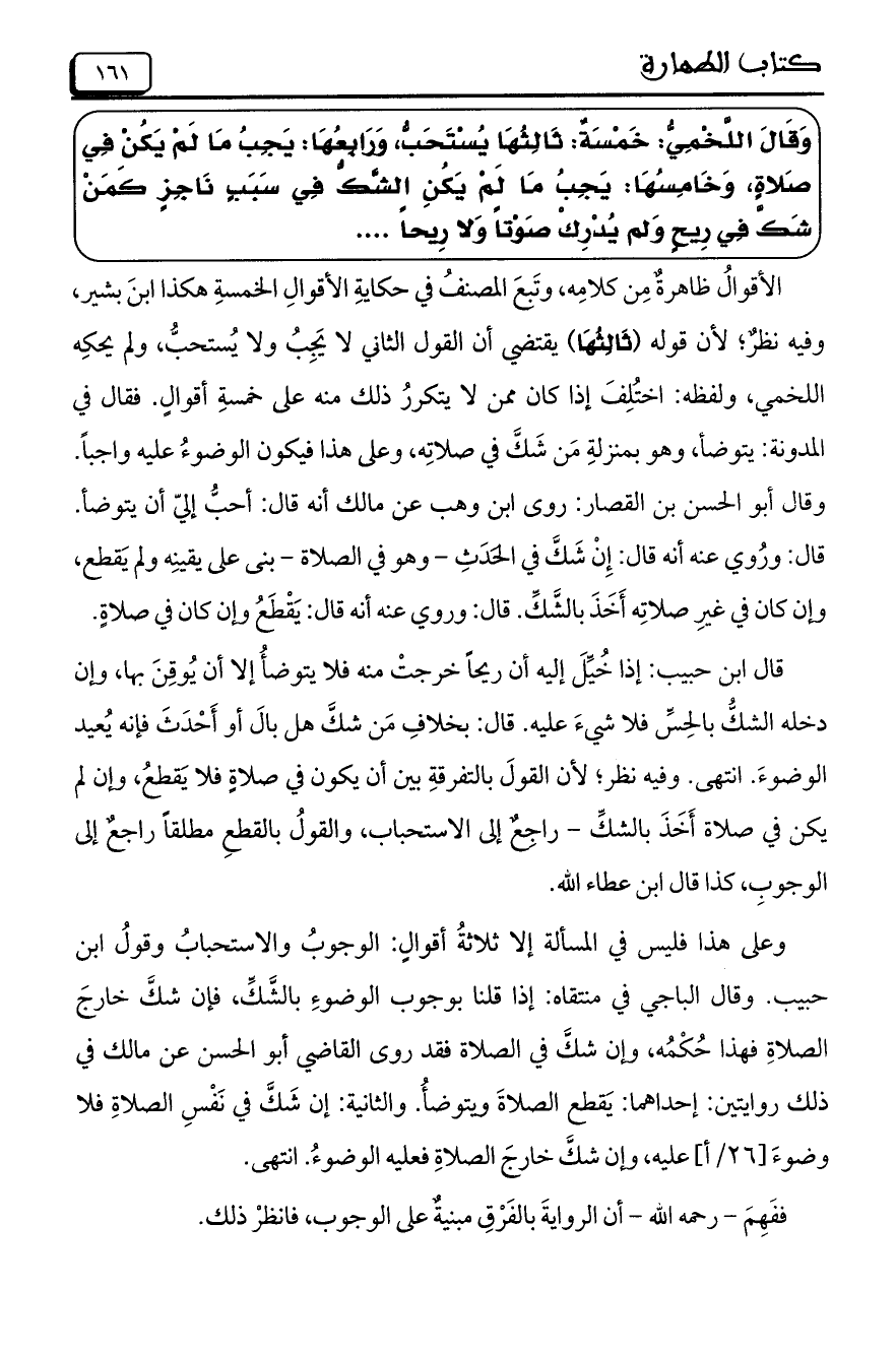 وَقَالَ اللَّخْمِيُّ: خَمْسَةٌ: ثَالِثُهَا يُسْتَحَبُّ، وَرَابِعُهَا: يَجِبُ مَا لَمْ يَكُنْ فِي صَلاةٍ، وخَامِسُهَا: يَجِبُ مَا لَمْ يَكُنِ الشَّكُّ فِي سَبَبٍ نَاجِزٍ كَمَنْ شَكَّ فِي رِيحٍ وَلم يُدْرِكْ صَوْتاً َولا ريحاً .......
