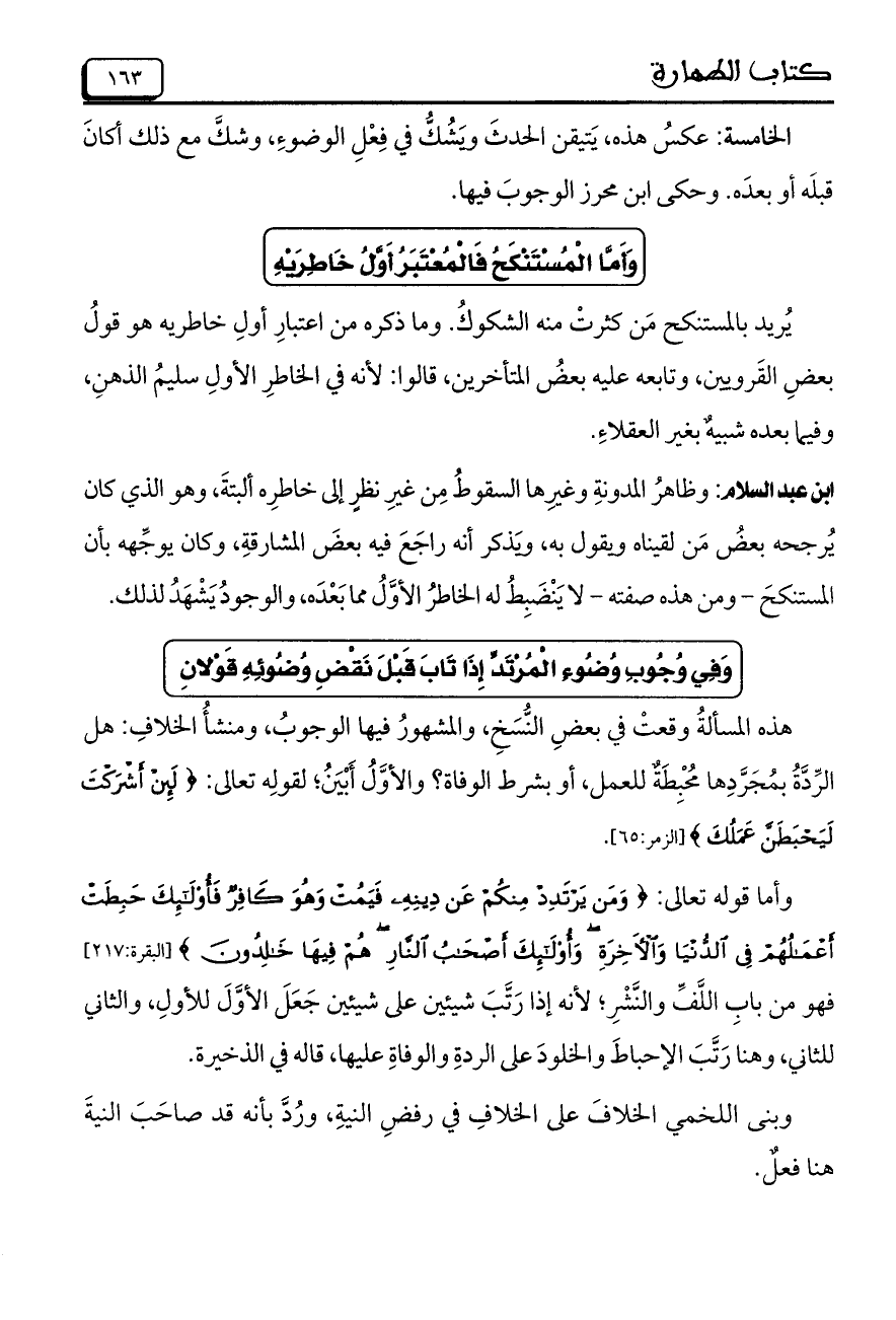 ابن عبد السلام: وظاهرُ المدونةِ وغيرِها السقوطُ من غيرِ نظرٍ إلى خاطرِه ألبتةَ، وهو الذي كان يُرجحه بعضُ مَن لقيناه ويقول به، ويَذكر أنه راجَعَ فيه بعضَ المشارقةِ، وكان يوجِّهه بأن المستنكحَ- ومن هذه صفته- لا يَنْضَبِطُ له الخاطرُ الأوَّلُ مما بَعْدَه، والوجودُ يَشْهَدُ لذلك.