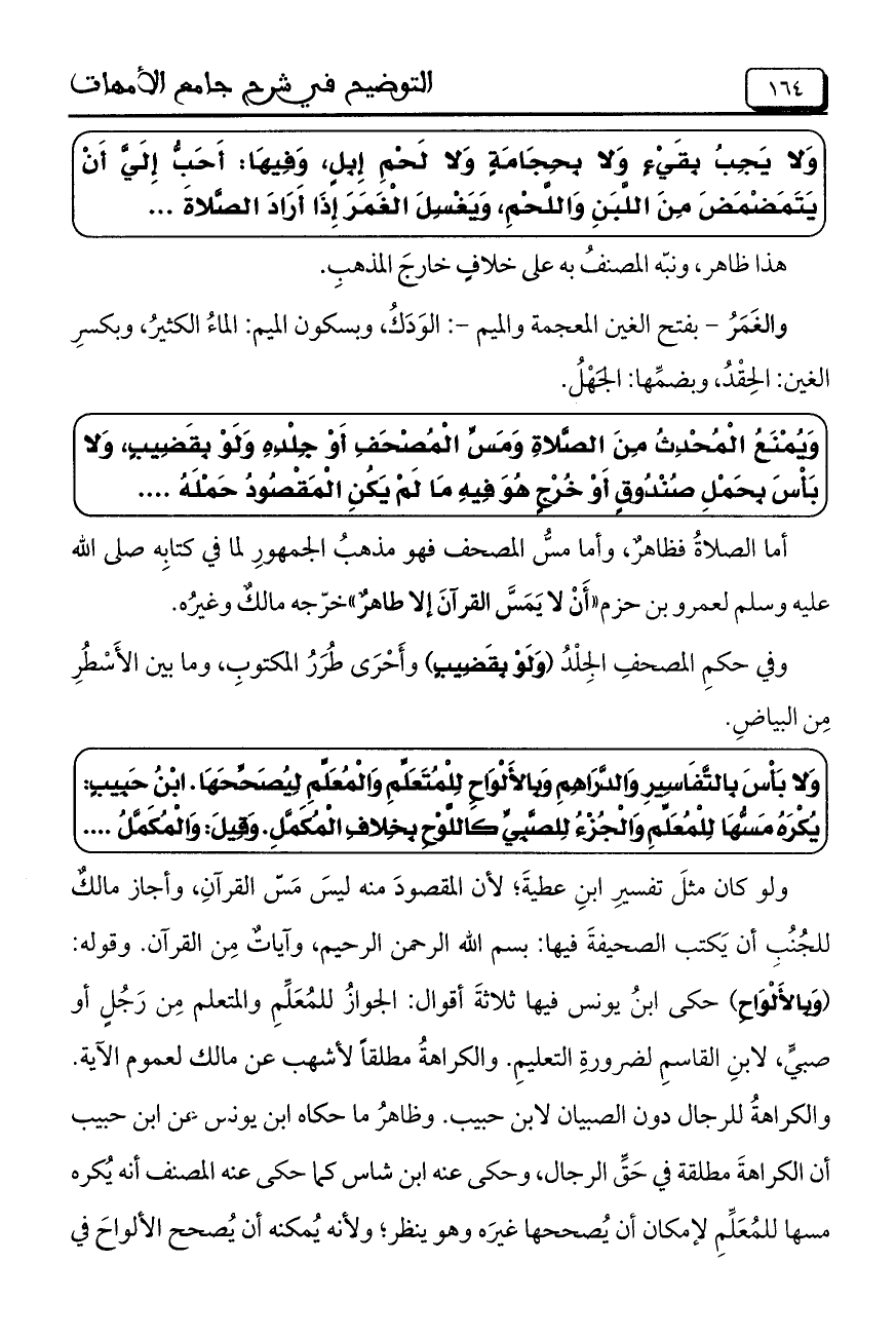 وَلا بَاسَ بِالتَّفَاسِيرِ وَالدَّرَاهِم وَبالأَلْوَاحِ لِلْمُتَعَلِّمِ وَالْمُعَلِّمِ لِيُصَحِّحَهَا. ابْن حَبِيبٍ: يُكْرَهُ مَسُّهَا لِلْمُعَلَّمِ وَالْجُزْءُ لِلصَّبِيِّ كَاللَّوْحِ بِخِلافِ الْمُكَمَّلِ. وَقِيلَ: وَالْمُكَمَّلُ ......