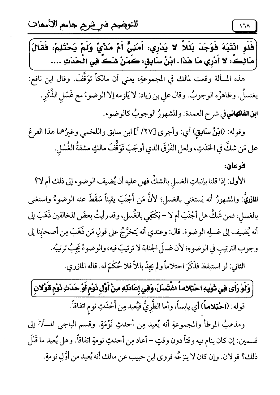 فَلَوِ انْتَبَهَ فَوَجَدَ بَلَلاً لا يَدْرِي: أَمَنِيٍّ أَمْ مَذْيٍّ وَلَمْ يَحْتَلِمْ، فَقَالَ مَالِكٌ: لا أَدْرِي مَا هَذَا. ابْنُ سَابِقٍ: كَمَنْ شَكَّ فِي الْحَدَثِ ....