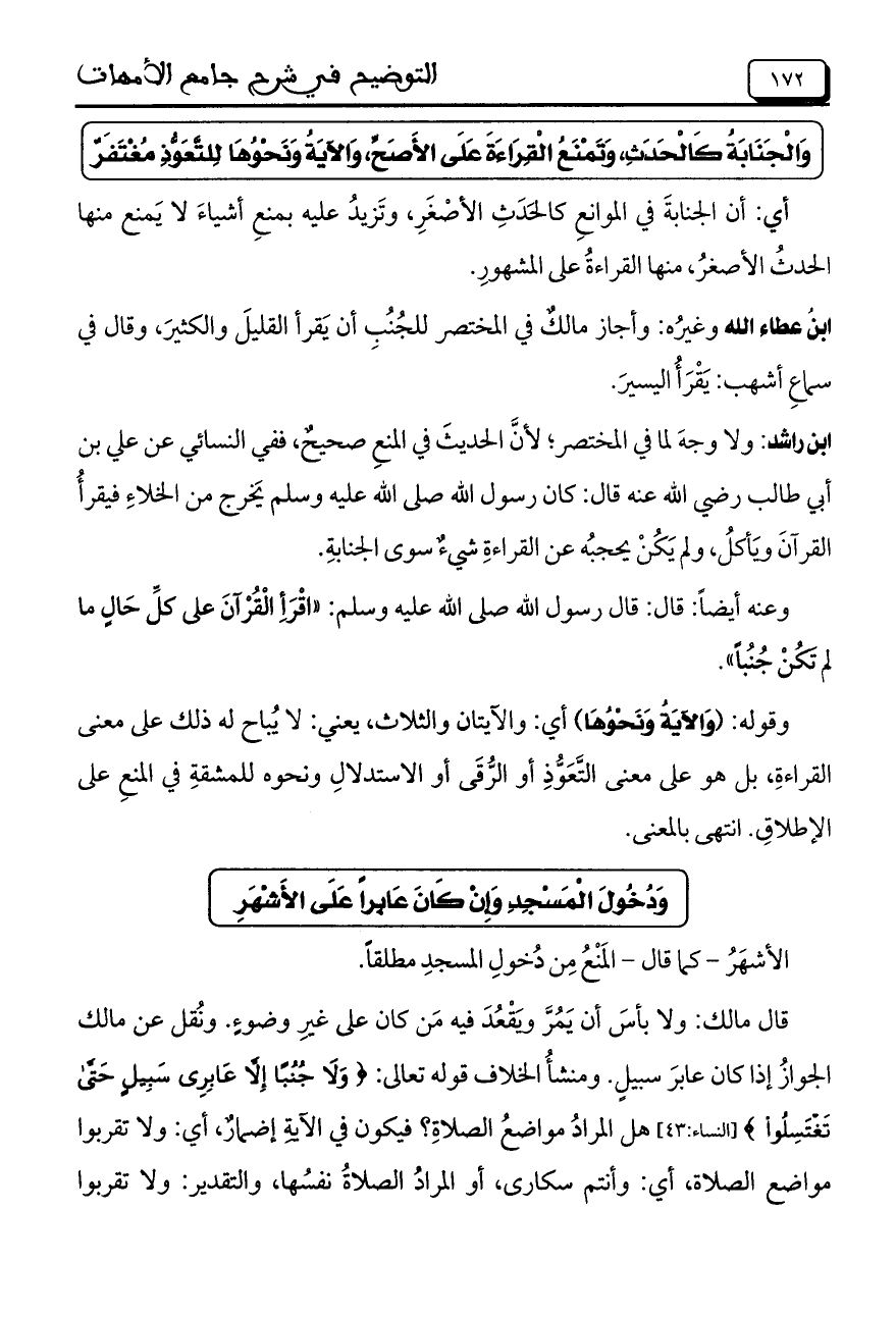 ابن راشد: ولا وجهَ لما في المختصر؛ لأنَّ الحديثَ في المنعِ صحيحٌ، ففي النسائي عن علي بن أبي طالب رضي الله عنه قال: كان رسول الله صلى الله عليه وسلم يَخرج من الخلاءِ فيقرأُ القرآنَ ويَأكلُ، ولم يَكُنْ يحجبُه عن القراءةِ شيءٌ سوى الجنابةِ.