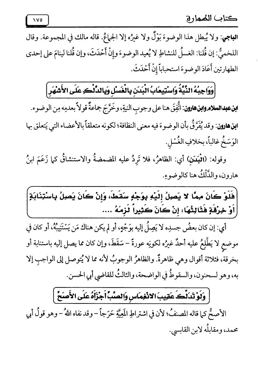 ابن عبد السلام وابن هارون: اتُفِقَ هنا على وجوبِ النيةِ، وخَرَّجَ جماعةٌ قولاً بعدمِه مِن الوضوء.