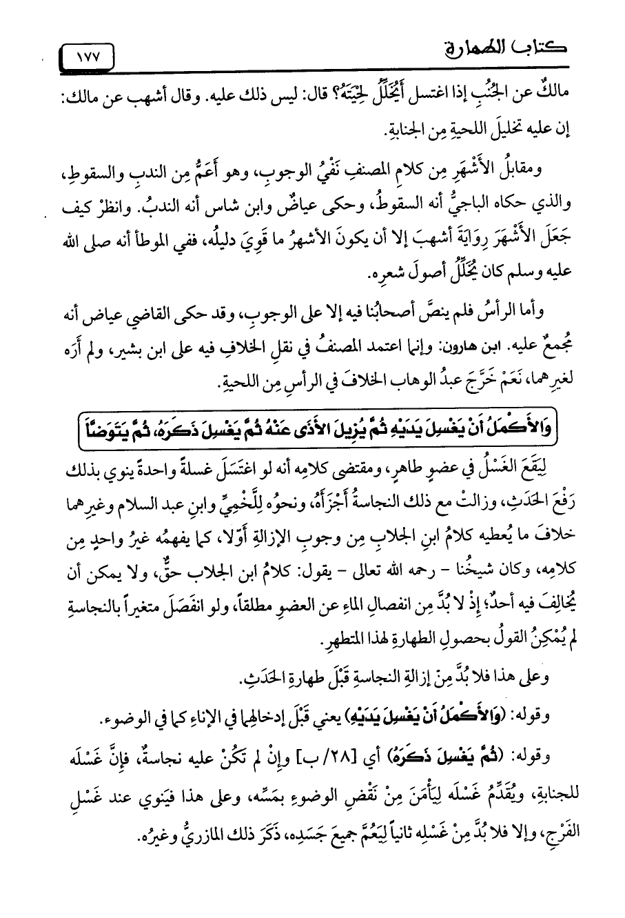 وقوله: (ثُمَّ يَغْسِلَ ذَكَرَهُ) أي [28/ب] وإِنْ لم تَكُنْ عليه نجاسةٌ، فإِنَّ غَسْلَه للجنابةِ، ويُقَدِّمُ غَسْلَه ليَامَنَ مِنْ نَقْضِ الوضوءِ بمَسِّه، وعلى هذا فيَنوي عند غَسْلِ الفَرْجِ، وإلا فلا بُدَّ مِنْ غَسْلِه ثانياً لِيَعُمَّ جميعَ جَسَدِه، ذَكَرَ ذلك المازريُّ وغيرُه.