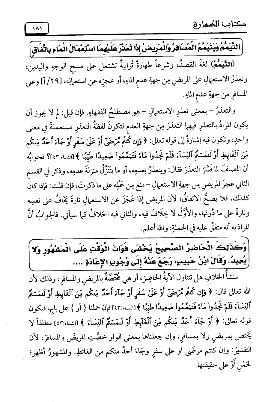 التَّيَمُّمُ وَيَتَيَمَّمُ الْمُسَافِرُ وَالْمَرِيضُ إِذَا تَعَذَّرَ عَلَيْهِمَا اسْتِعْمَالُ الْمَاءِ باتِّفَاقٍ