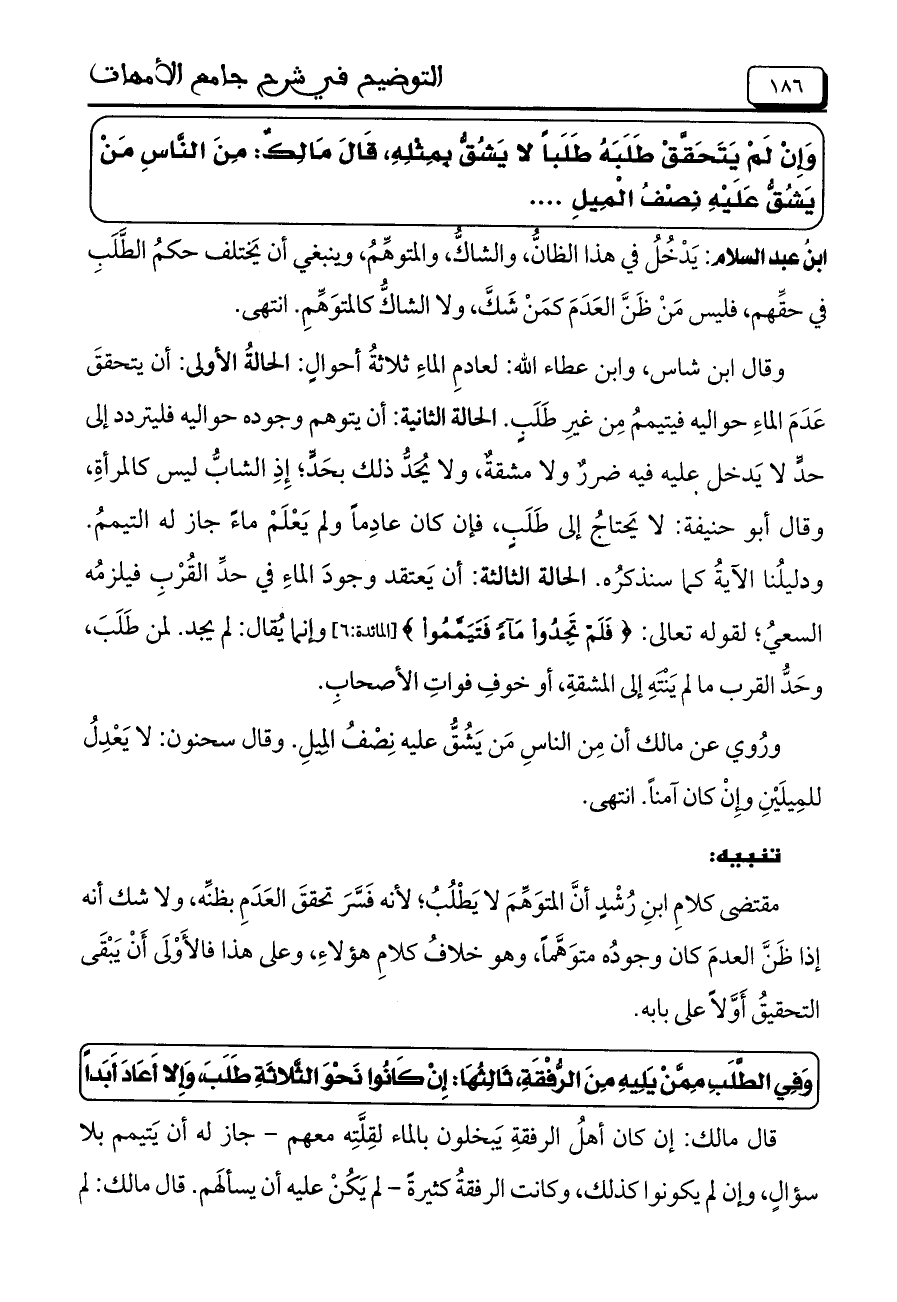 وقال ابن شاس، وابن عطاء الله: لعادمِ الماءِ ثلاثةُ أحوالٍ: الحالةُ الأولى: أن يتحققَ عَدَمَ الماءِ حواليه فيتيممُ مِن غيرِ طَلَبٍ. الحالة الثانية: أن يتوهم وجوده حواليه فليتردد إلى حدٍّ لا يَدخل عليه فيه ضررٌ ولا مشقةٌ، ولا يُحَدُّ ذلك بحَدٍّ؛ إِذِ الشابُّ ليس كالمرأةِ، وقال أبو حنيفة: لا يَحتاجُ إلى طَلَبٍ، فإن كان عادِماً ولم يَعْلَمْ ماءً جاز له التيممُ. ودليلُنا الآيةُ كما سنذكرُه. الحالة الثالثة: أن يَعتقد وجودَ الماءِ في حدِّ القُرْبِ فيلزمُه السعيُ؛ لقوله تعالى: {فَلَمْ تَجِدُوا مَآءً فَتَيَمَّمُوا} (المائدة: 6) وإنما يُقال: لم يجد، لمن طَلَبَ، وحَدُّ القرب ما لم يَنْتَهِ إلى المشقةِ، أو خوفِ فواتِ الأصحابِ.