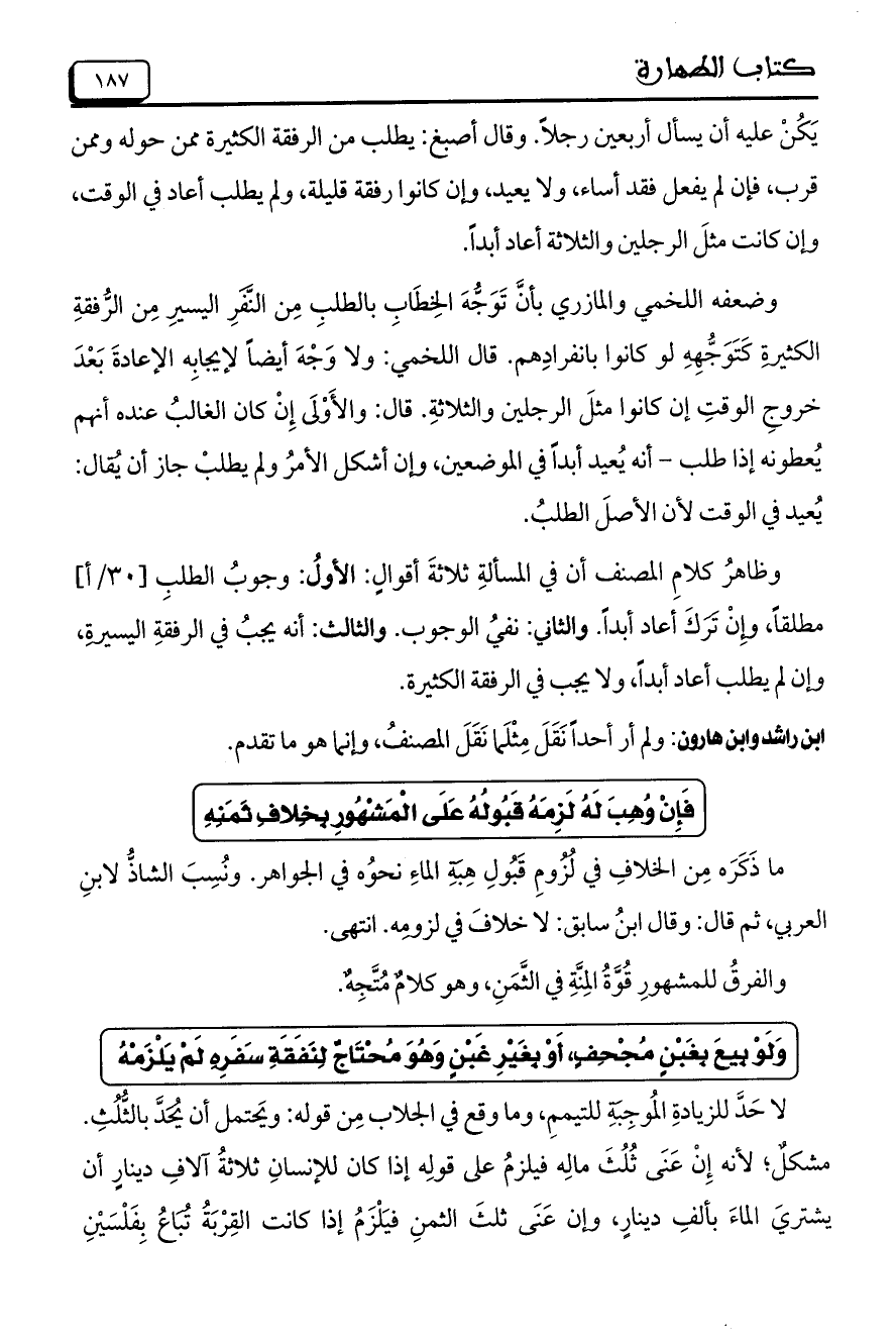 وضعفه اللخمي والمازري بأنَّ تَوَجُّهَ الخِطَابِ بالطلبِ مِن النَّفَرِ اليسيرِ مِن الرُّفقةِ الكثيرةِ كَتَوَجُّهِهِ لو كانوا بانفرادِهم. قال اللخمي: ولا وَجْهَ أيضاً لإيجابِه الإعادةَ بَعْدَ خروجِ الوقتِ إن كانوا مثلَ الرجلين والثلاثةِ. قال: والأَوْلَى إِنْ كان الغالبُ عنده أنهم يُعطونه إذا طلب – أنه يُعيد أبداً في الموضعين، وإن أشكل الأمرُ ولم يطلبْ جاز أن يُقال: يُعيد في الوقت لأن الأصلَ الطلبُ.