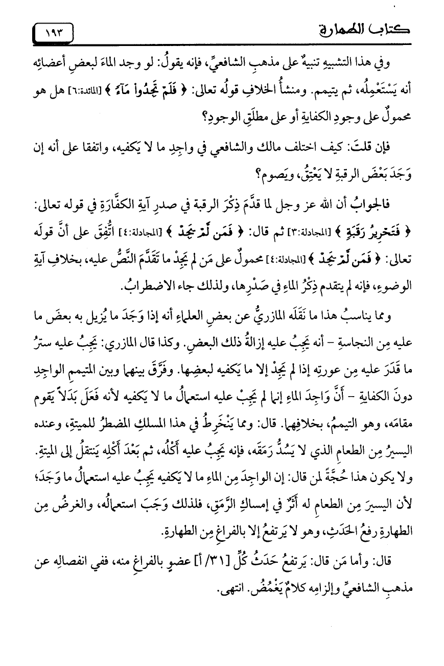 ولا يكون هذا حُجَّةً لمن قال: إن الواجِدَ مِن الماءِ ما لا يَكفيه يَجِبُ عليه استعمالُ ما وَجَدَ؛ لأن اليسيرَ مِن الطعامِ له أَثَرٌ في إمساكِ الرَّمَقِ، فلذلك وَجَبَ استعمالُه، والغرضُ مِن الطهارةِ رفعُ الحَدَثِ، وهو لا يَرتفعُ إلا بالفراغِ مِن الطهارةِ.